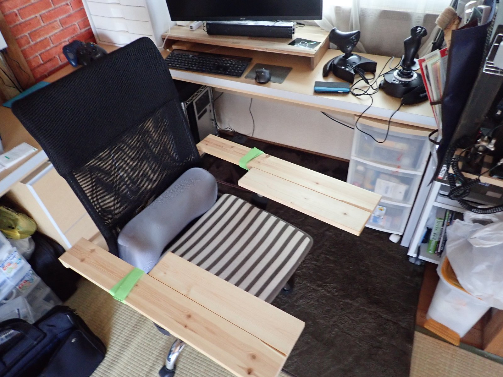 フライトスティックを購入したのは良いのですが、今度は置き場に困り利用していませんでした。そこで、家にある廃材で棚みたいなものを作ろうかなと考えました。 最初は椅子の横に棚を作るつもりでしたが、椅子のひじ掛けがありスティックまで遠くなることが判明。ということで、ひじ掛けに載せるように作れば良いことに気づき「まずは組み立ててみるか」ということになりました。 幸い、家にDIYで使った1x4の廃材が有ったので、椅子に合わせて切断し、ひじ掛けに載せてみました。