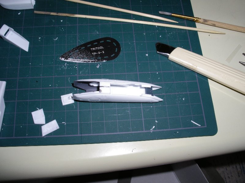 | 今回の最大のテーマである着陸脚の閉じた状態に改造します。まずは、邪魔な部分を取り除きます。 | |