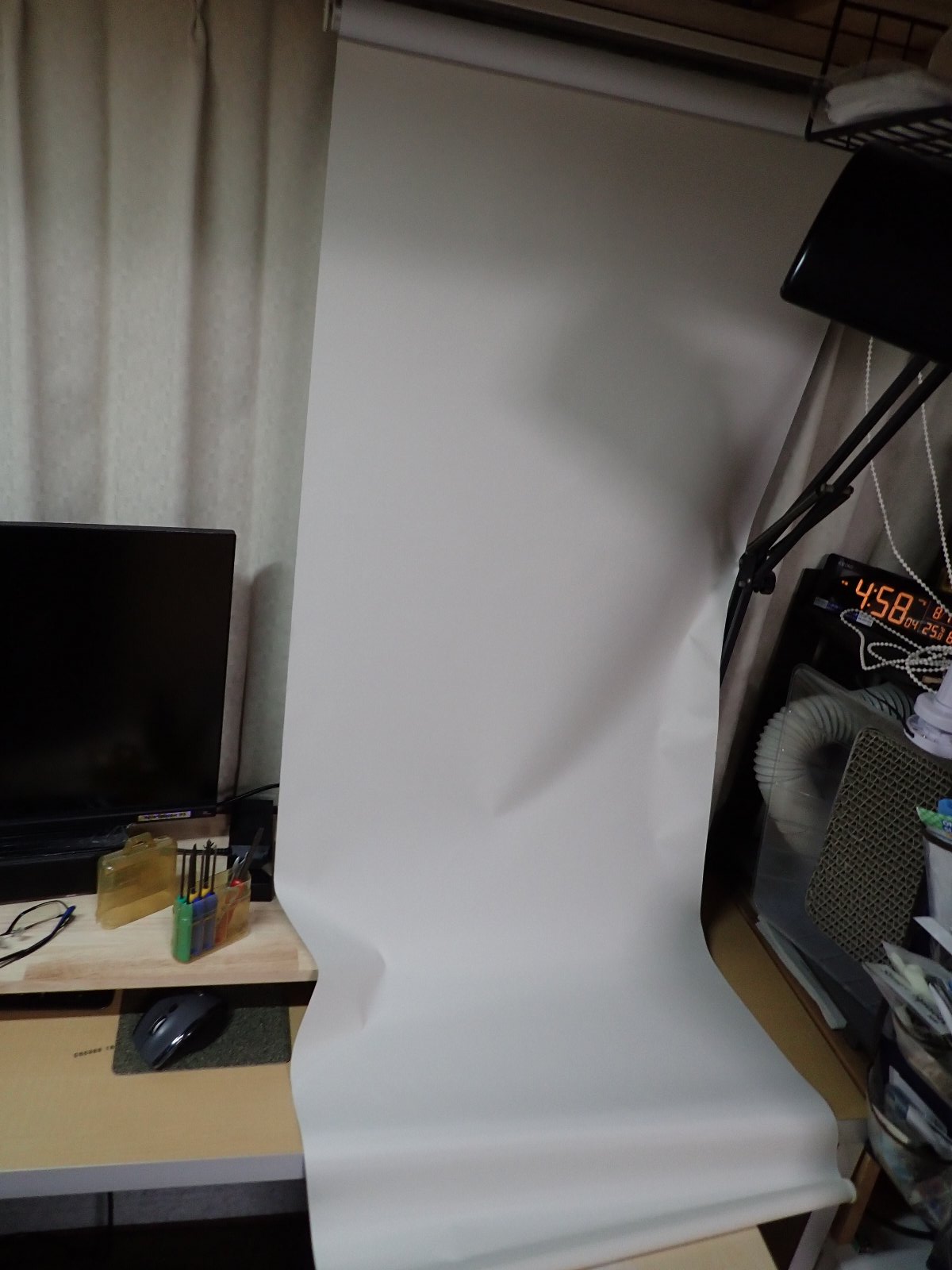 思い付きで撮影スペースを作ってみました。折り畳みの撮影ブースはありますが、ロールスクリーンなら手軽に出し入れできるのではないかと。