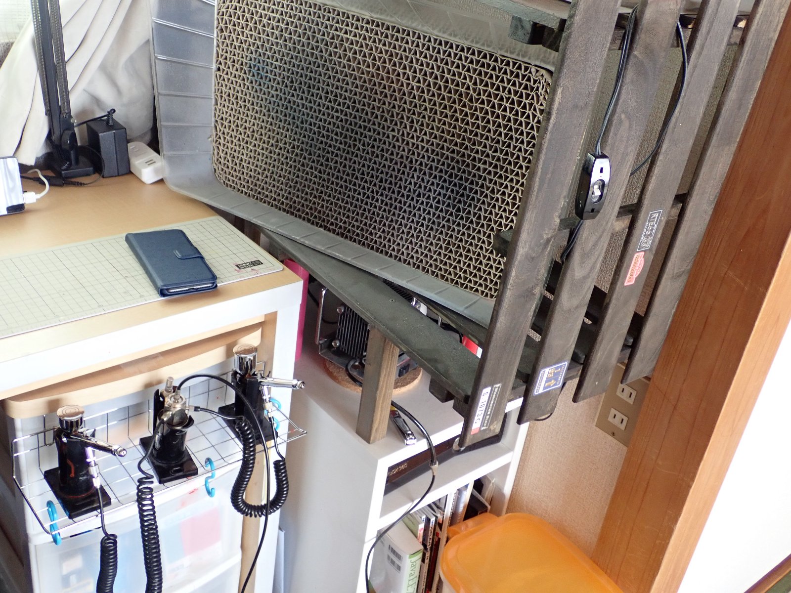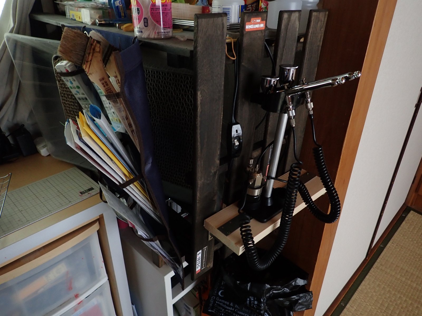 今までエアブラシは道具入れの引き出しにつけてたんですが、良くひっかけて落とすので背の高いスタンドを購入してみました。