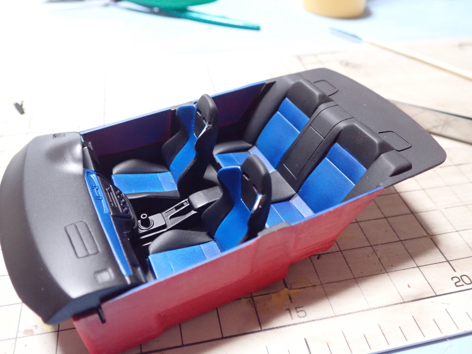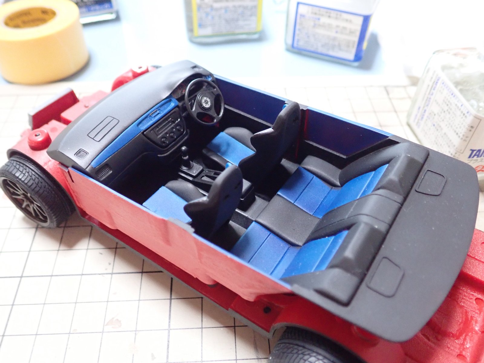 シャーシの次は内装も塗り分けます。ランエボ8は青の差し色が特徴なんですね。本当はもっと紺に近い青だけど明るくなってしまいました。