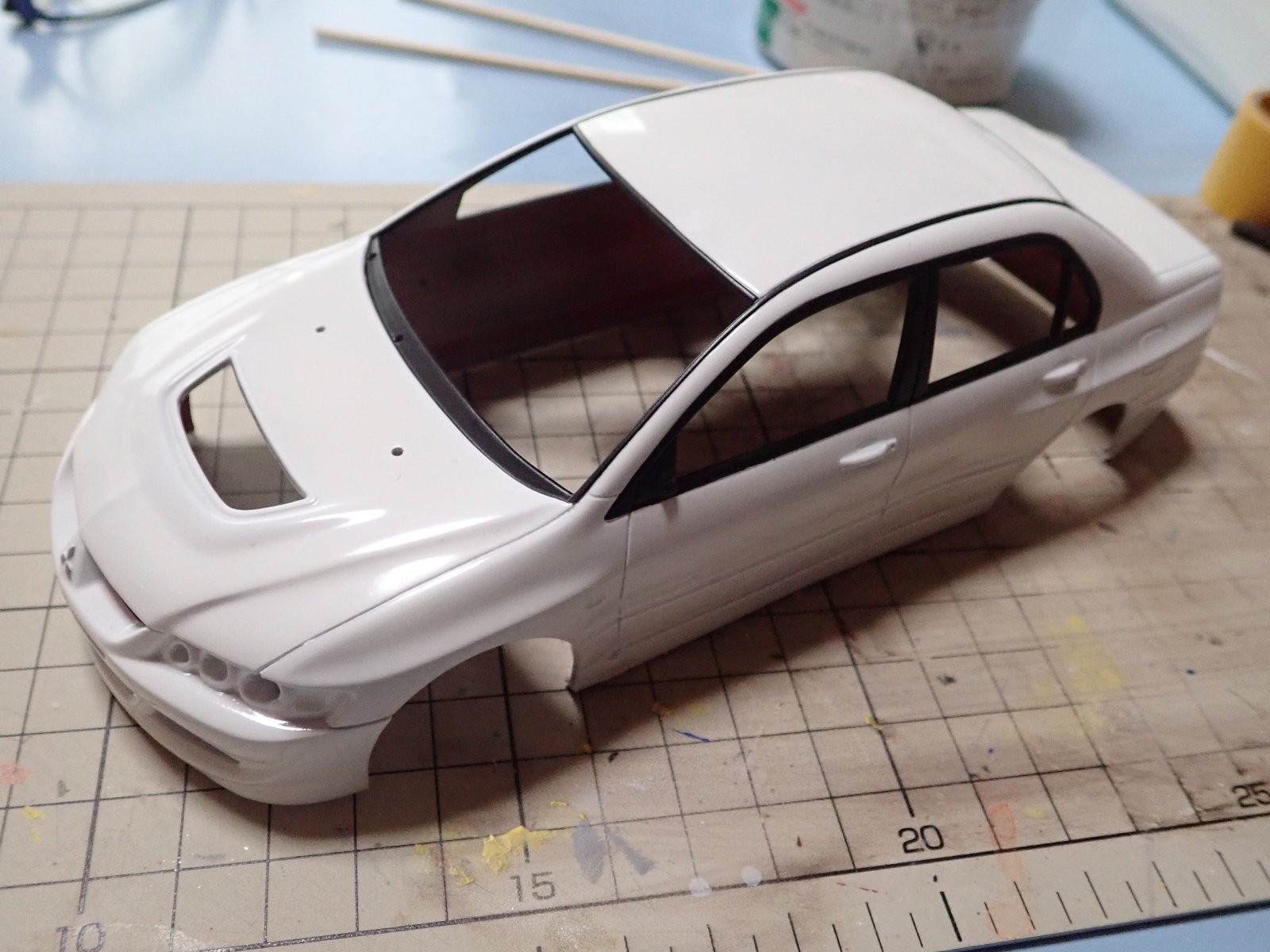 今回のランエボは久々の白塗装です(笑)。イメージが白なのでボディ色は白にしてみました。