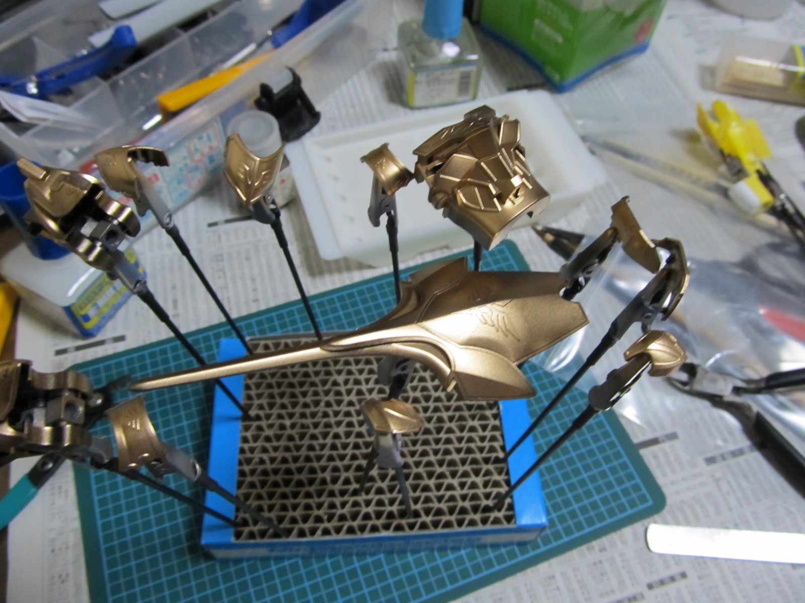 金の柄が入るところは、ラッカーで金を塗装した後にエナメルで塗装して拭き取る作戦で行きます。そのため、金を塗っておきます。