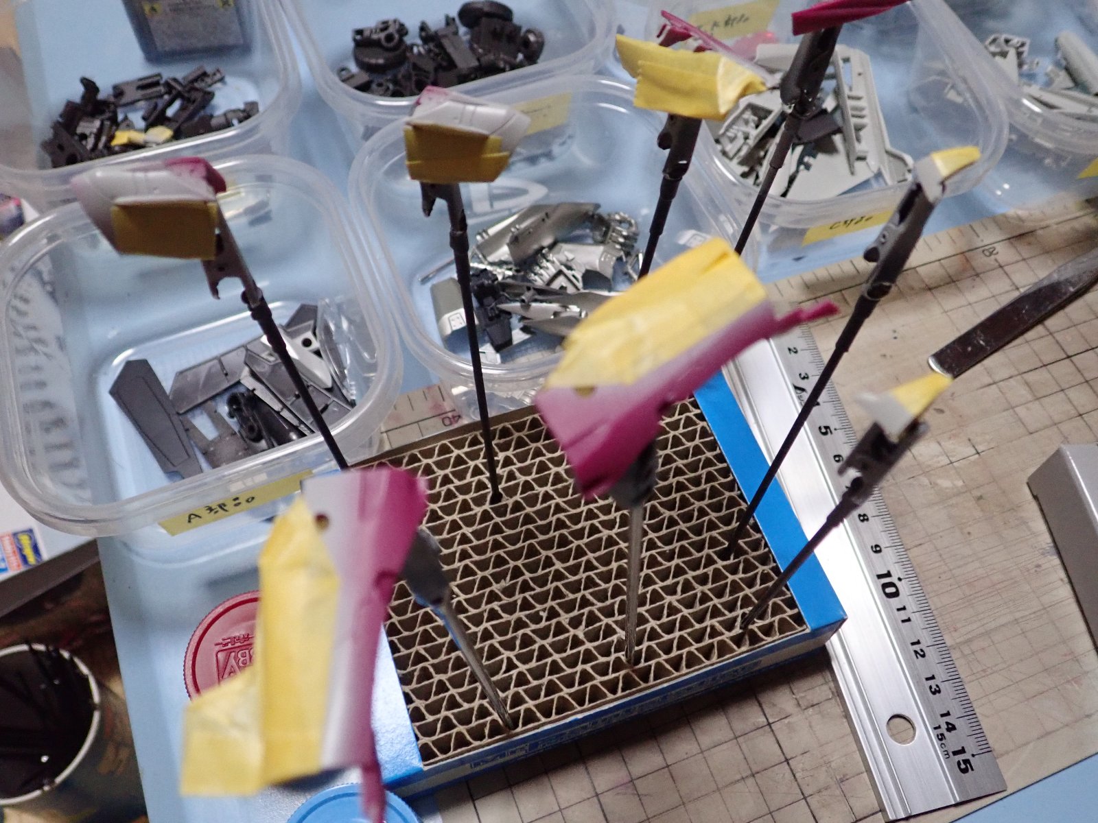 表面処理をしてから、塗装を始めました。ミラージュドラケンはマーキングシールが付いていないので基本的な部分は塗装で塗り分けていきます。使った色は以下です。