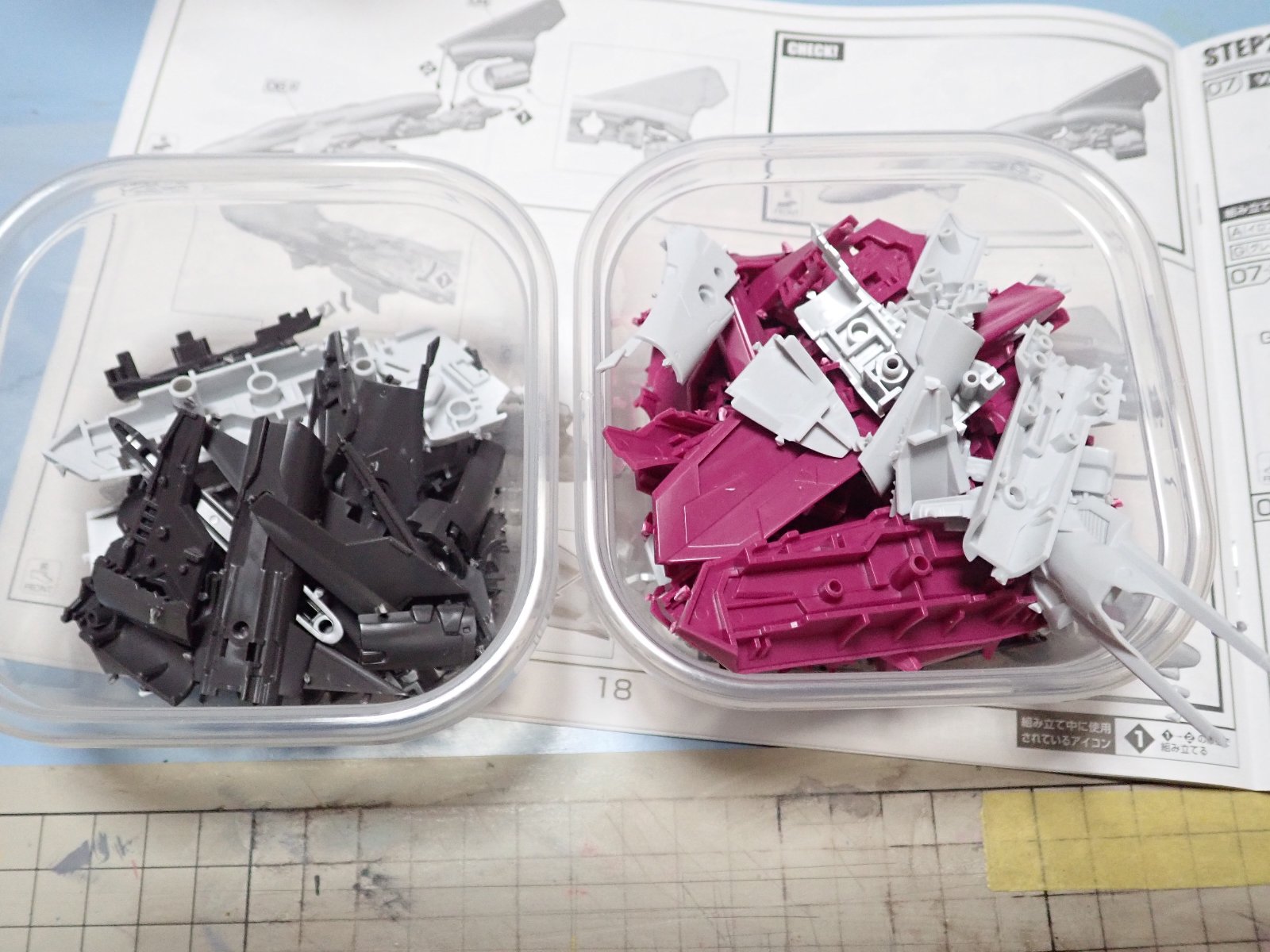 このミラージュ機は、色分けが相当苦労したのか同じランナーの色違いがたくさん入っていて余る部品が半端ないです。でも、塗装できない人にとっては助かりますよね。