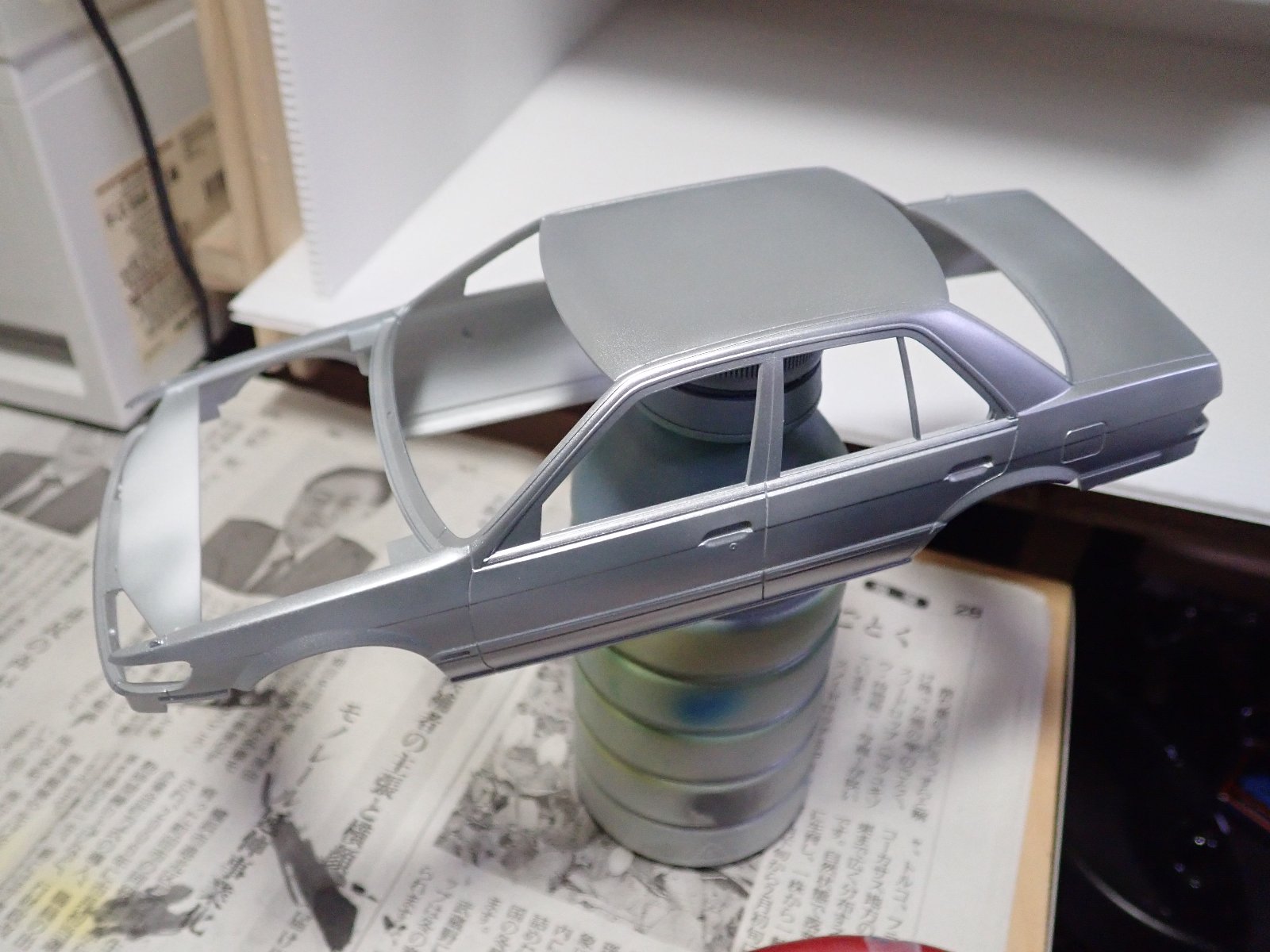 ボディ塗装を始めます。捨てサフ吹いた後に1500番で表面を慣らしてからガンクロームを吹きました。白に塗るつもりですがそのベースとして塗っています。