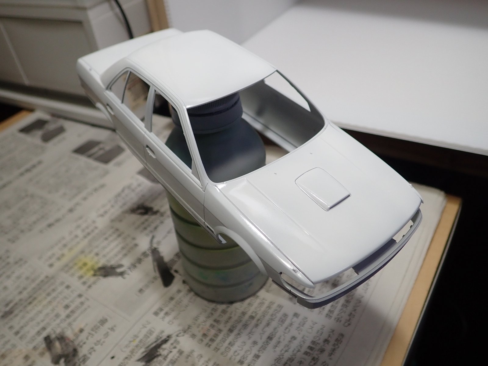 ボディ色を塗ります。今回はクレオスのGXホワイトです。シルバーが下地だからかちょっと深い(鉄っぽい)白になりました。