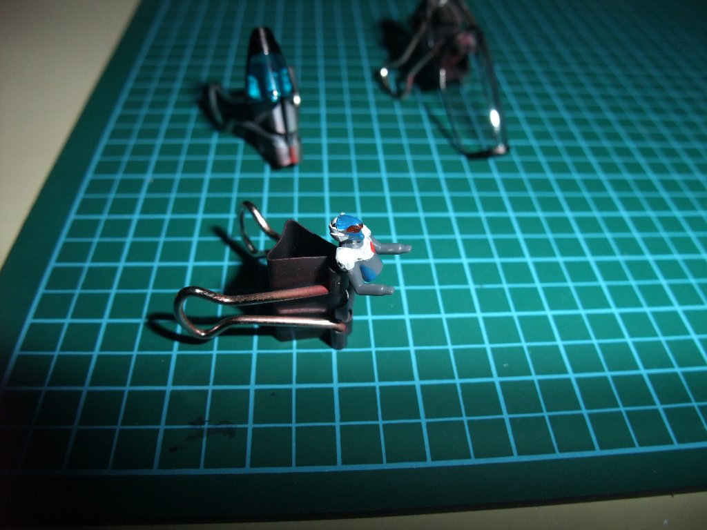 パイロットは適当な色分けでそれっぽく。キャノピー前部はクリヤーパープルで塗装。キャノピーの黒枠はガンダムマーカーの黒で書いてます。
