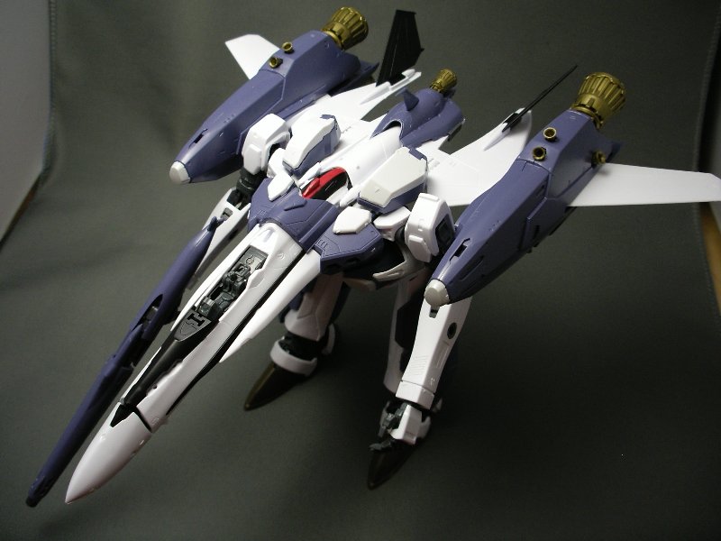 ブースターも含めて「組み立て」が完了。こんなに形になるまで時間のかかるプラモデルもなかなかないでしょうね。正直、ファイターとバトロイドは文句のつけようがないのですがガウォークはいまひとつだなぁと感じますね。特にマクロスFの1話でのイメージが強いせいか脚がハの字に出来ないのは大いなる不満です(笑)