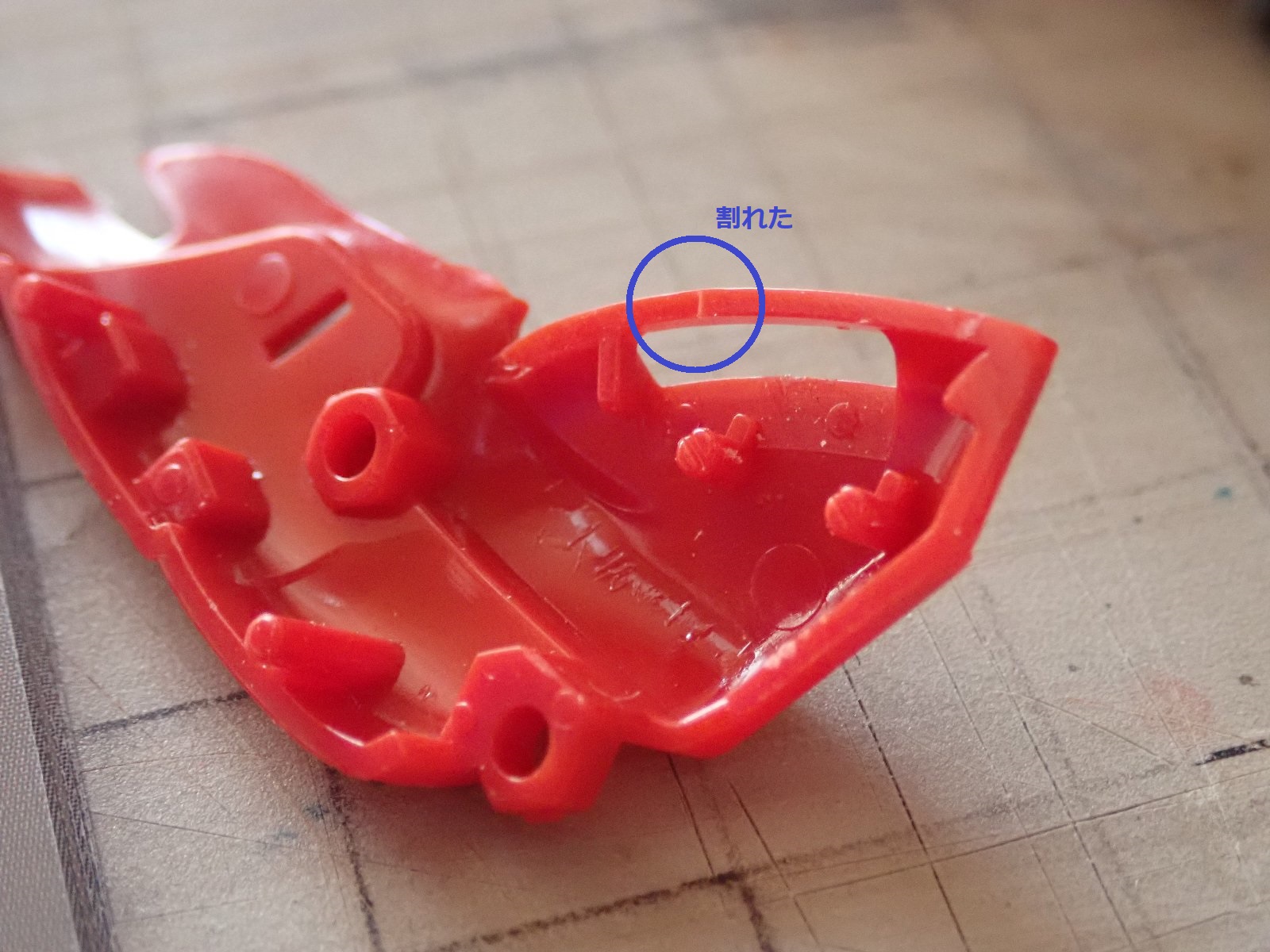 RG ユニコーンガンダムに続いてシナンジュも仮組からバラし始めました。そして同じように部品破損の嵐となってしまいました。まずは肩の黄色い部品を外す箇所で割れた。