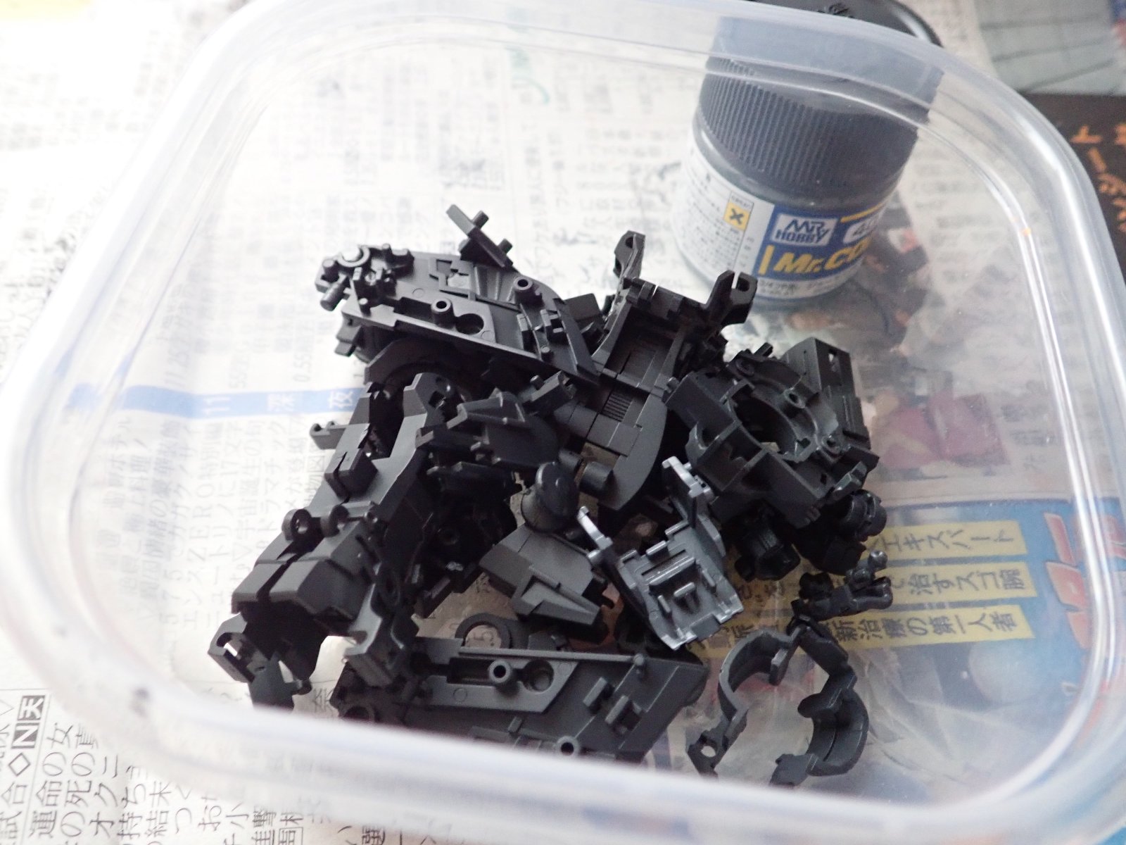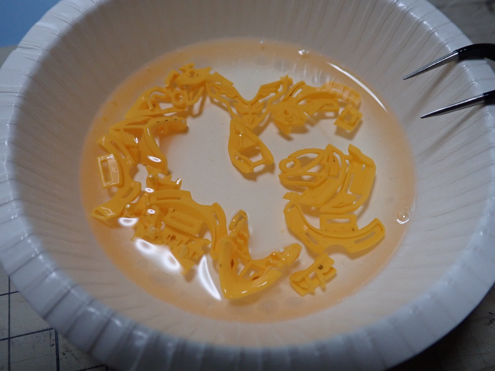 本日はシナンジュのメッキ落としです。まずはMr薄め液に漬けて、コーティングされたイエローを落とします。