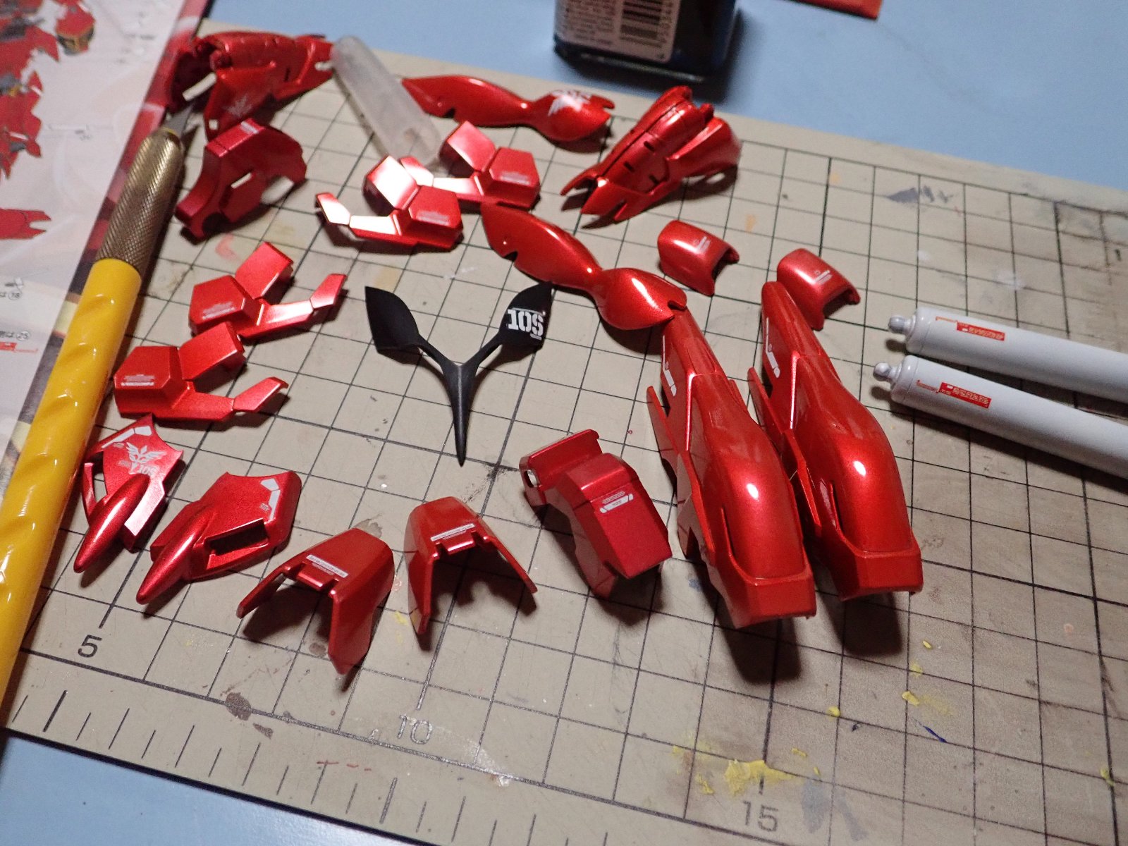 塗装を進めていきます。フレーム部分はジャーマングレー(40)、一部はアクセントでメタリックグレイで塗っています。頭部などの暗い赤はチタンシルバーの上にクリアーレッドと少量のダーククリアレッド、明るい赤はチタンゴールドの上にクリアーレッドで塗装します。ここはRGサザビーと同じ塗装方法です。