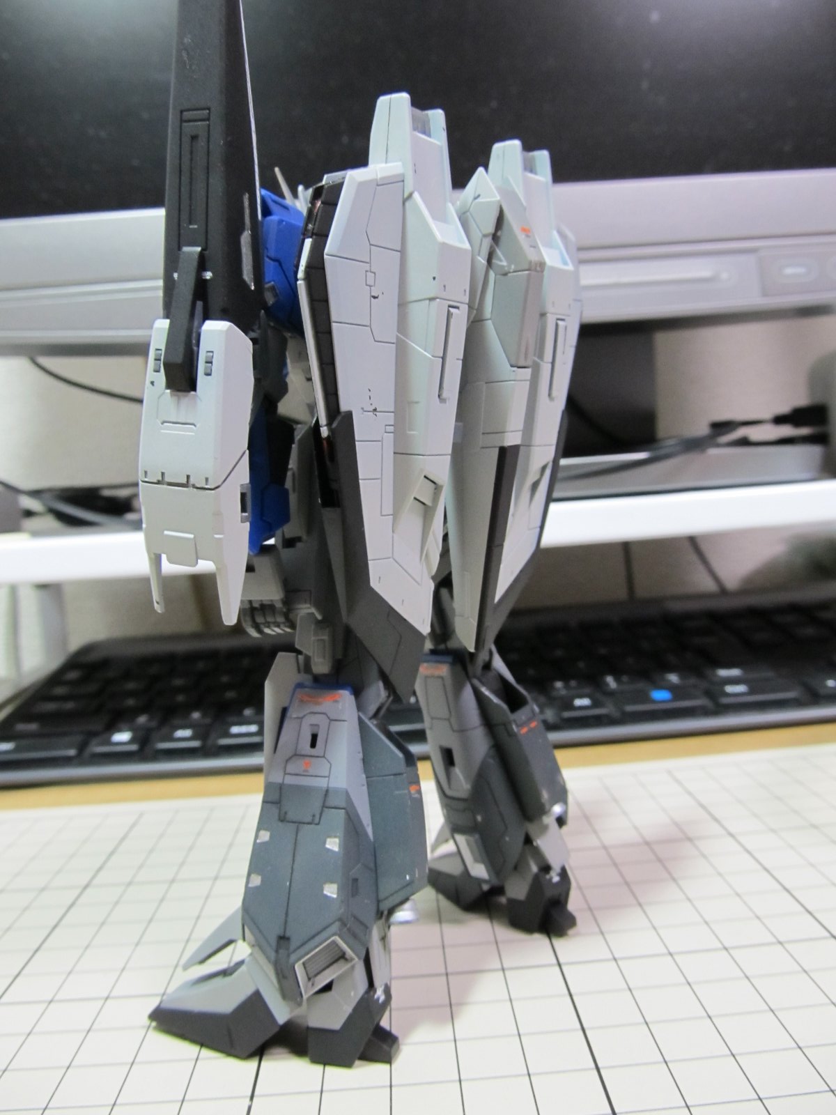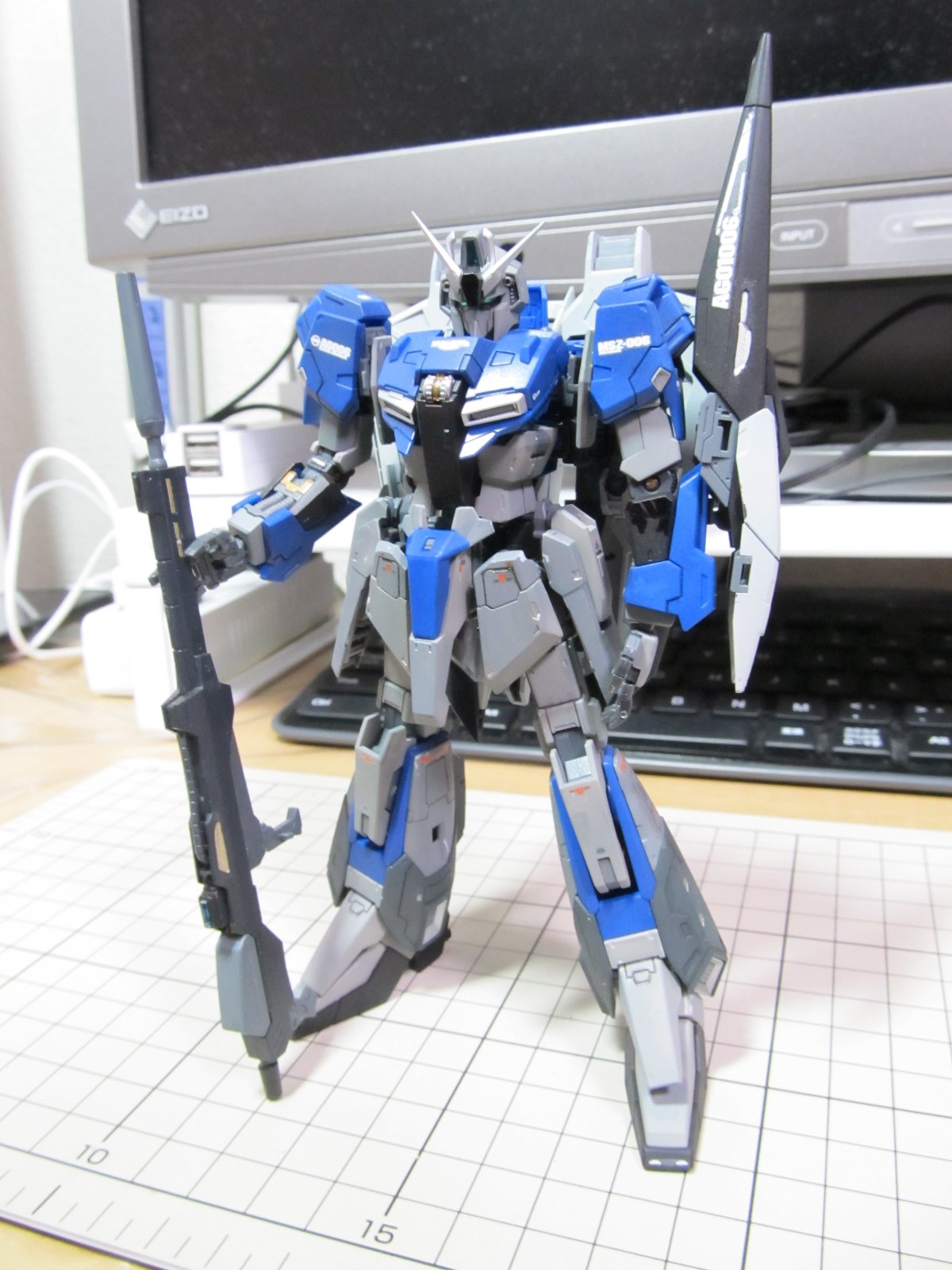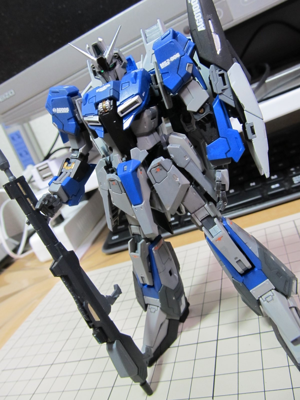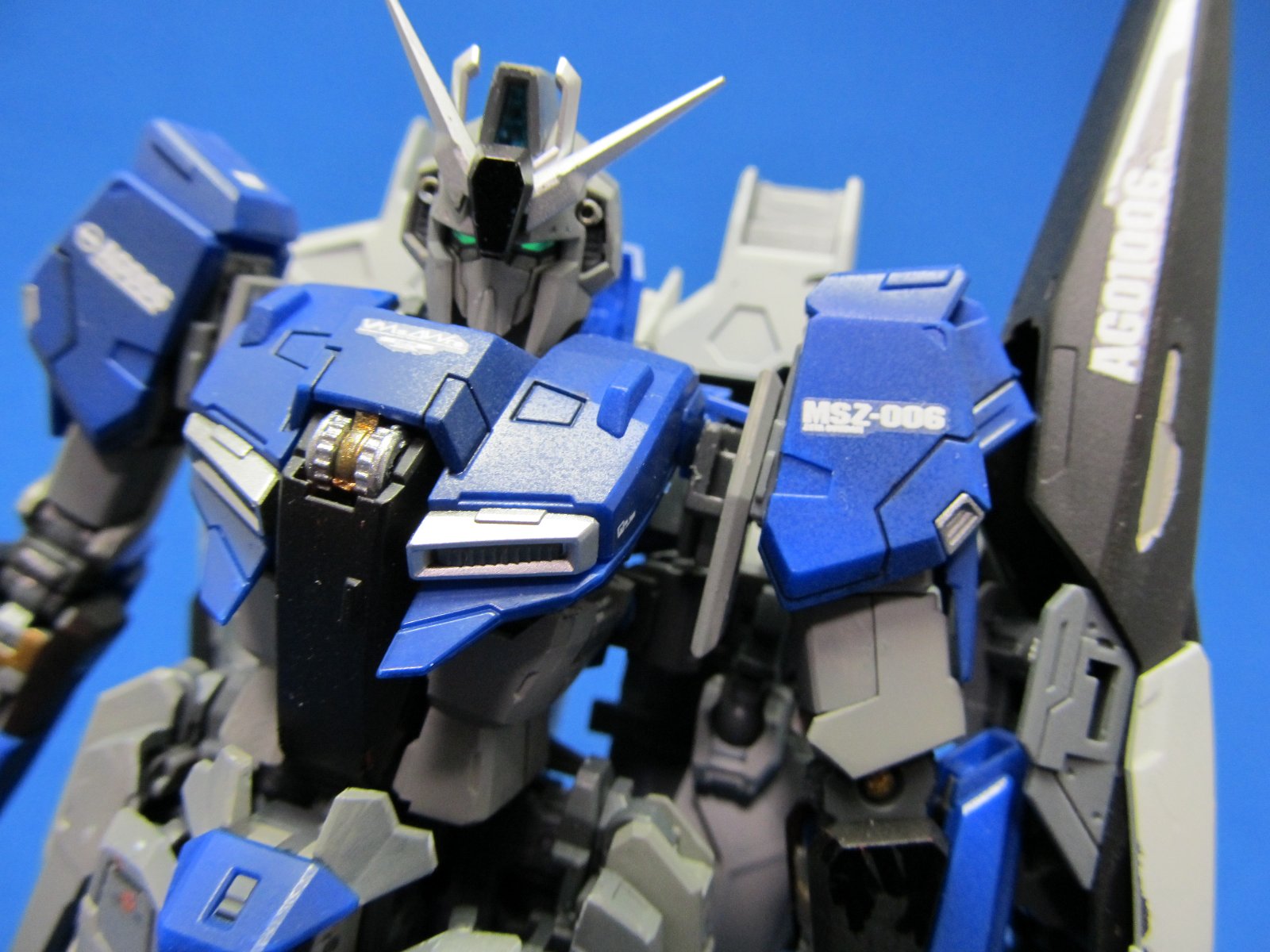 完成後に撮影し直しました。まだMS形態だけですけれども。基本的にカッチリ組みあがり変形後も綺麗に仕上がるという名作キットだと思います。Zが好きな人は購入して損はないでしょうね。ただ変形という機構上、塗装が剥げるので基本的に簡単フィニッシュをお勧めします。今回は色変えをしましたが、全塗装はお勧めできません。