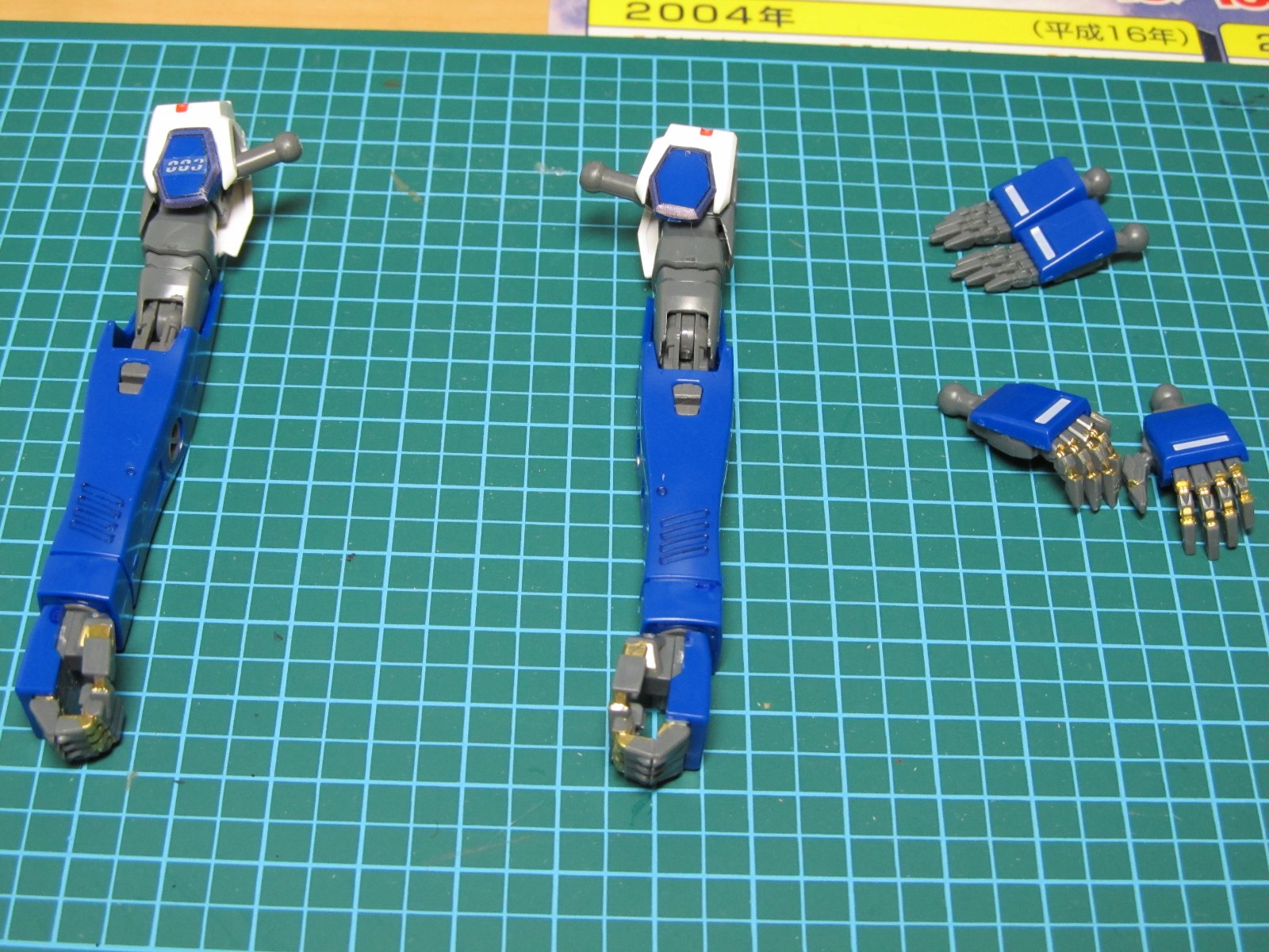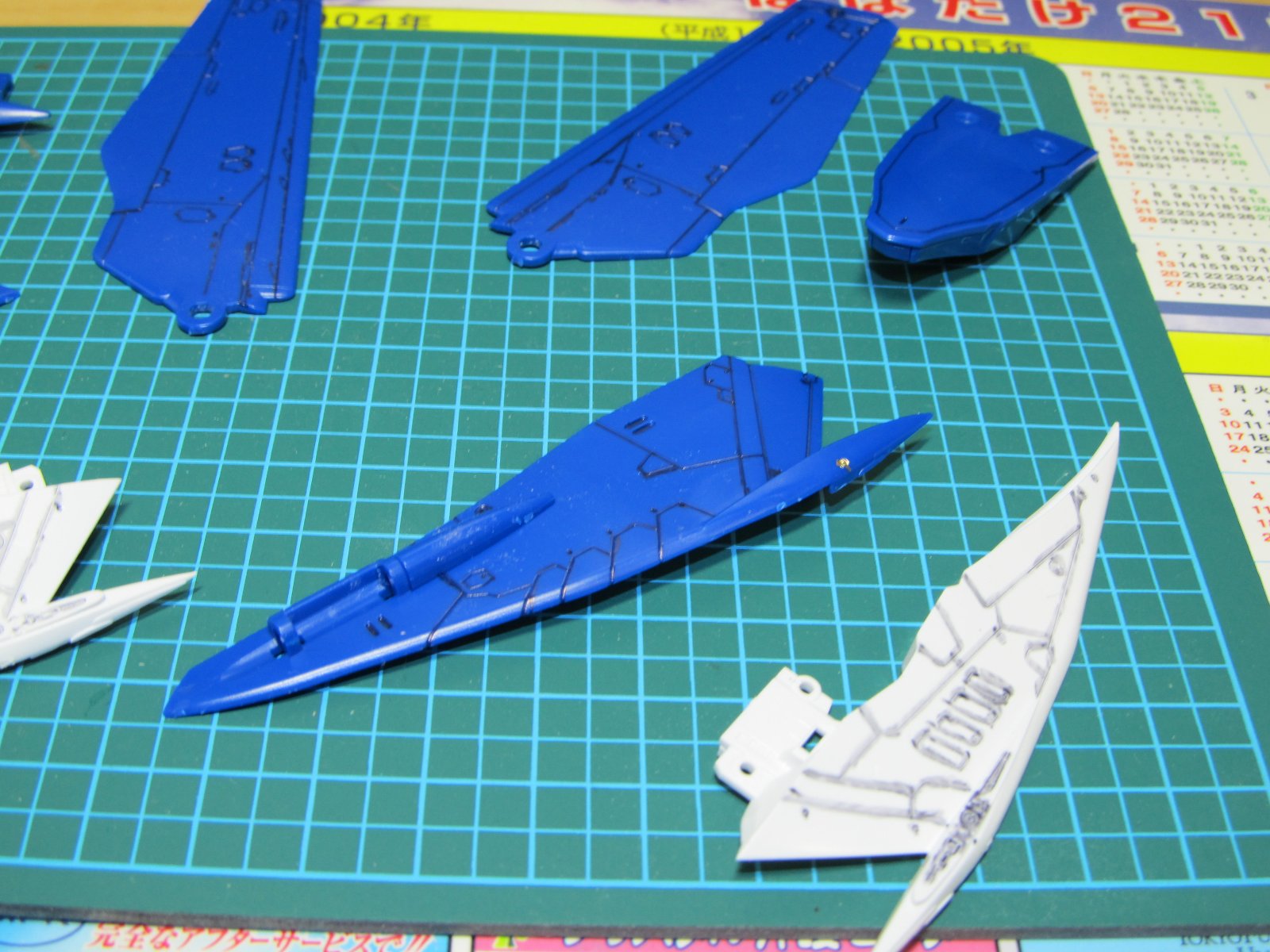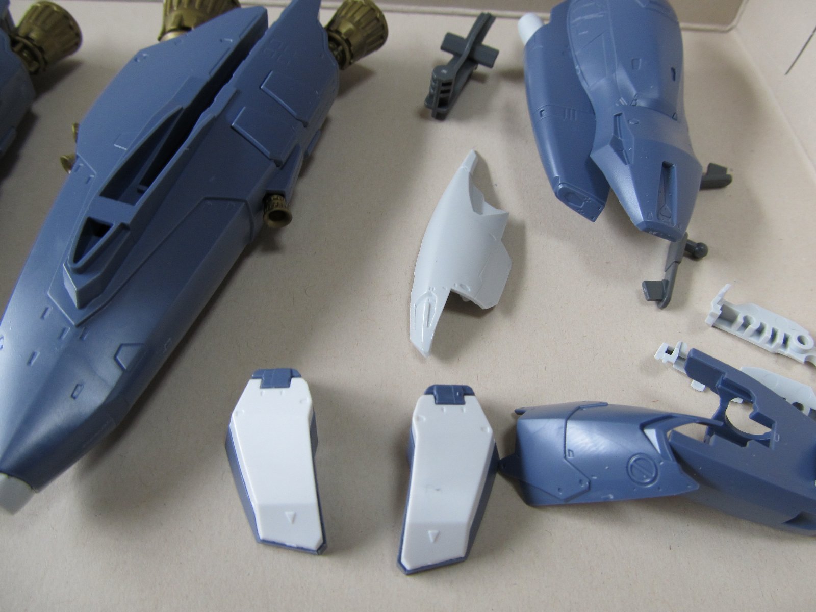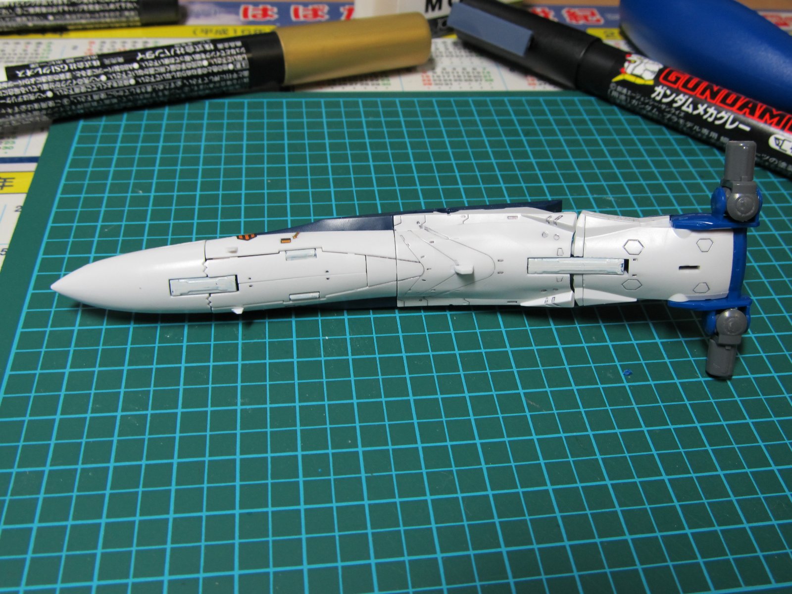 | 重い腰を上げて、組み立て開始です。実に2年ぶり(笑)連結部分の青いパーツはガンダムマーカーの白で塗っています。スミイレはリアルグレーです。 | |