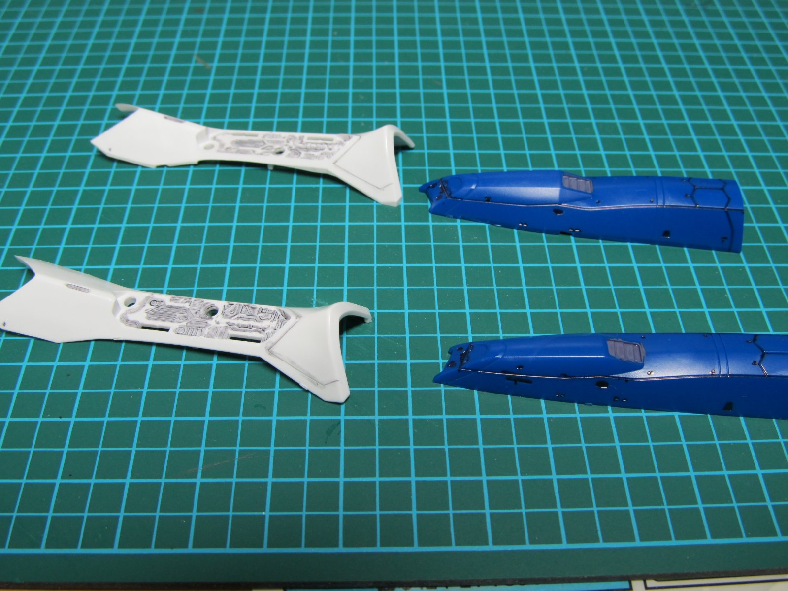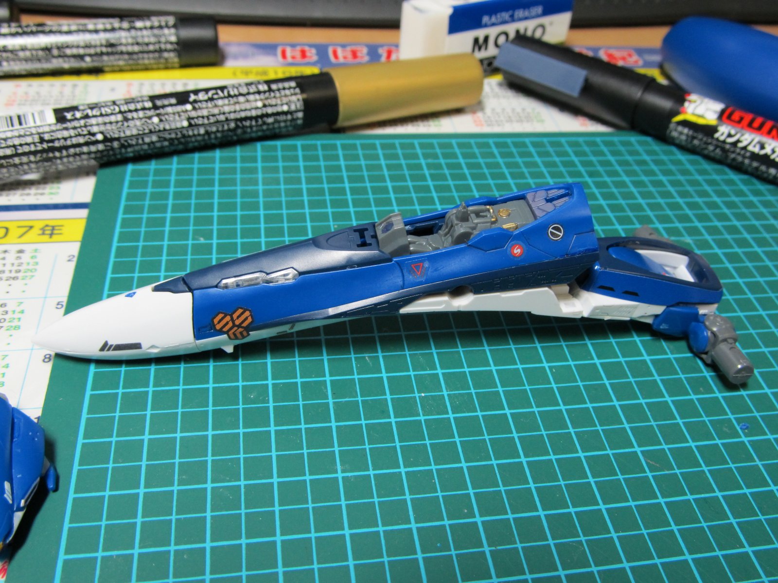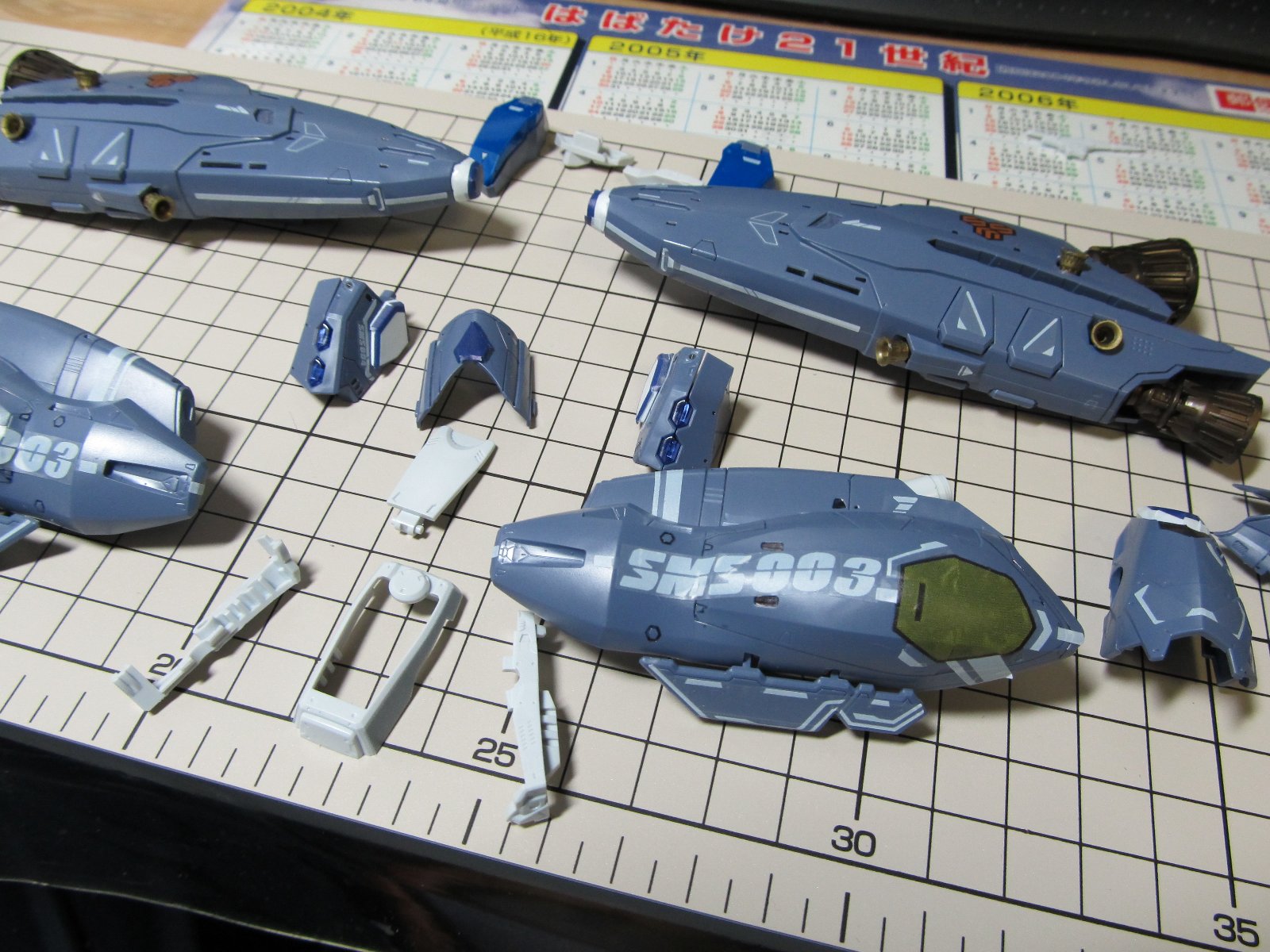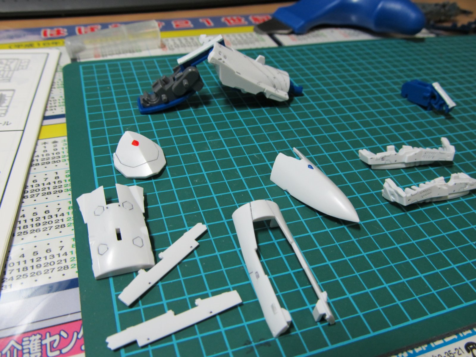 | 重い腰を上げて、組み立て開始です。実に2年ぶり(笑)連結部分の青いパーツはガンダムマーカーの白で塗っています。スミイレはリアルグレーです。 | |