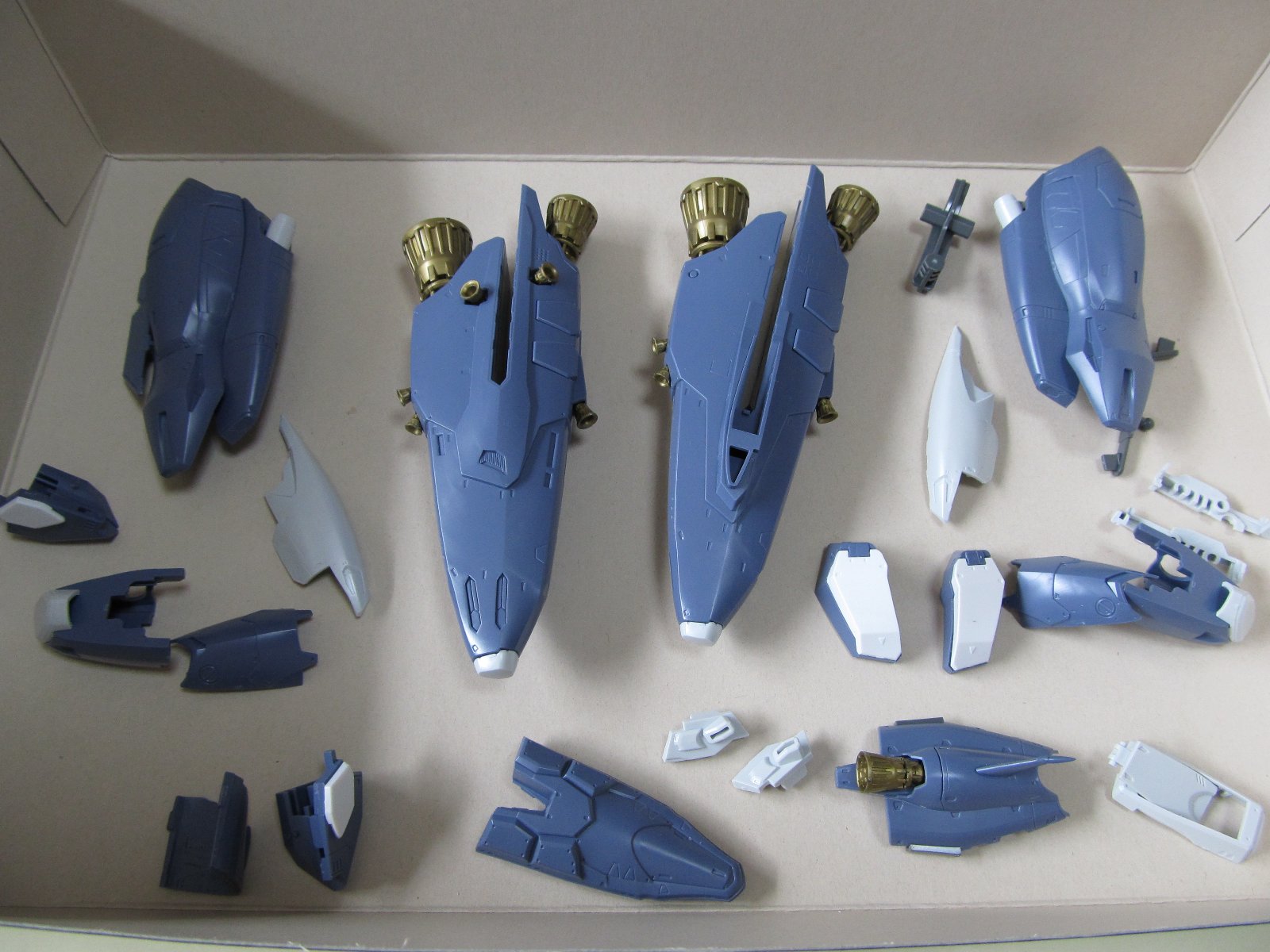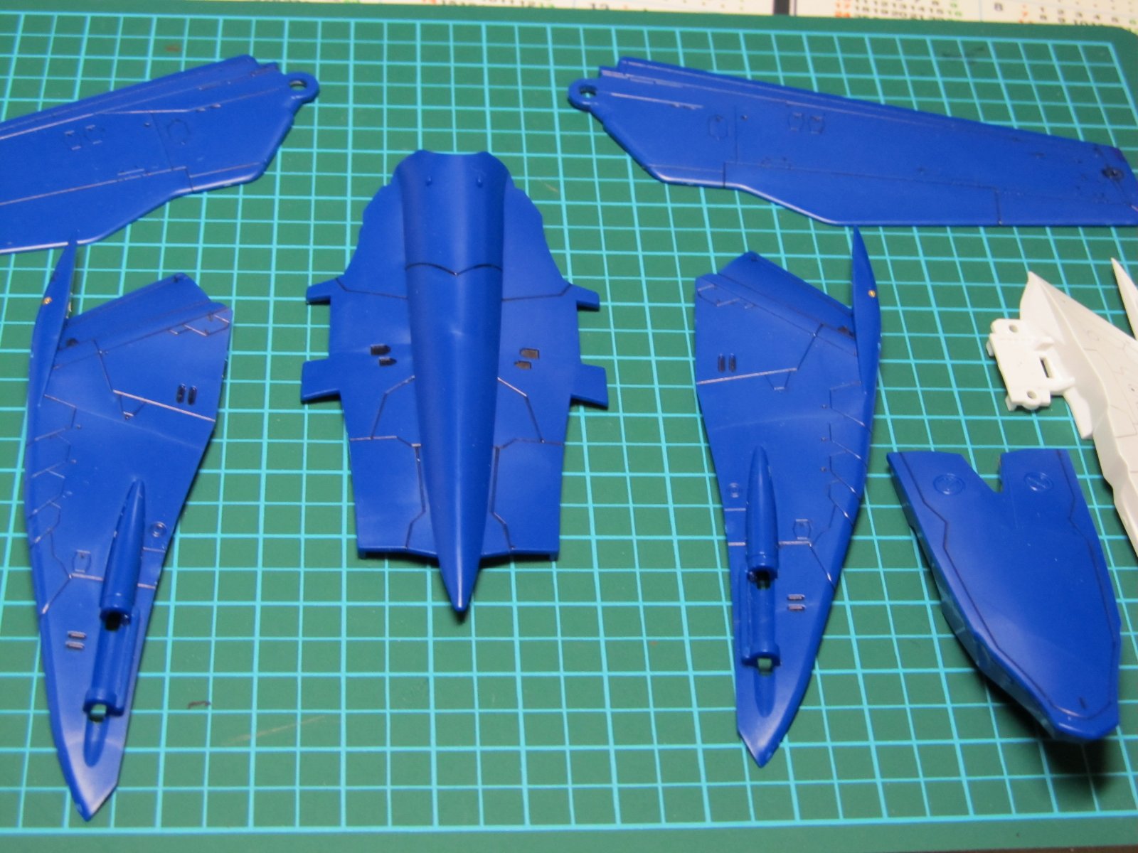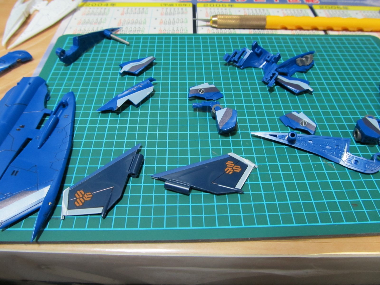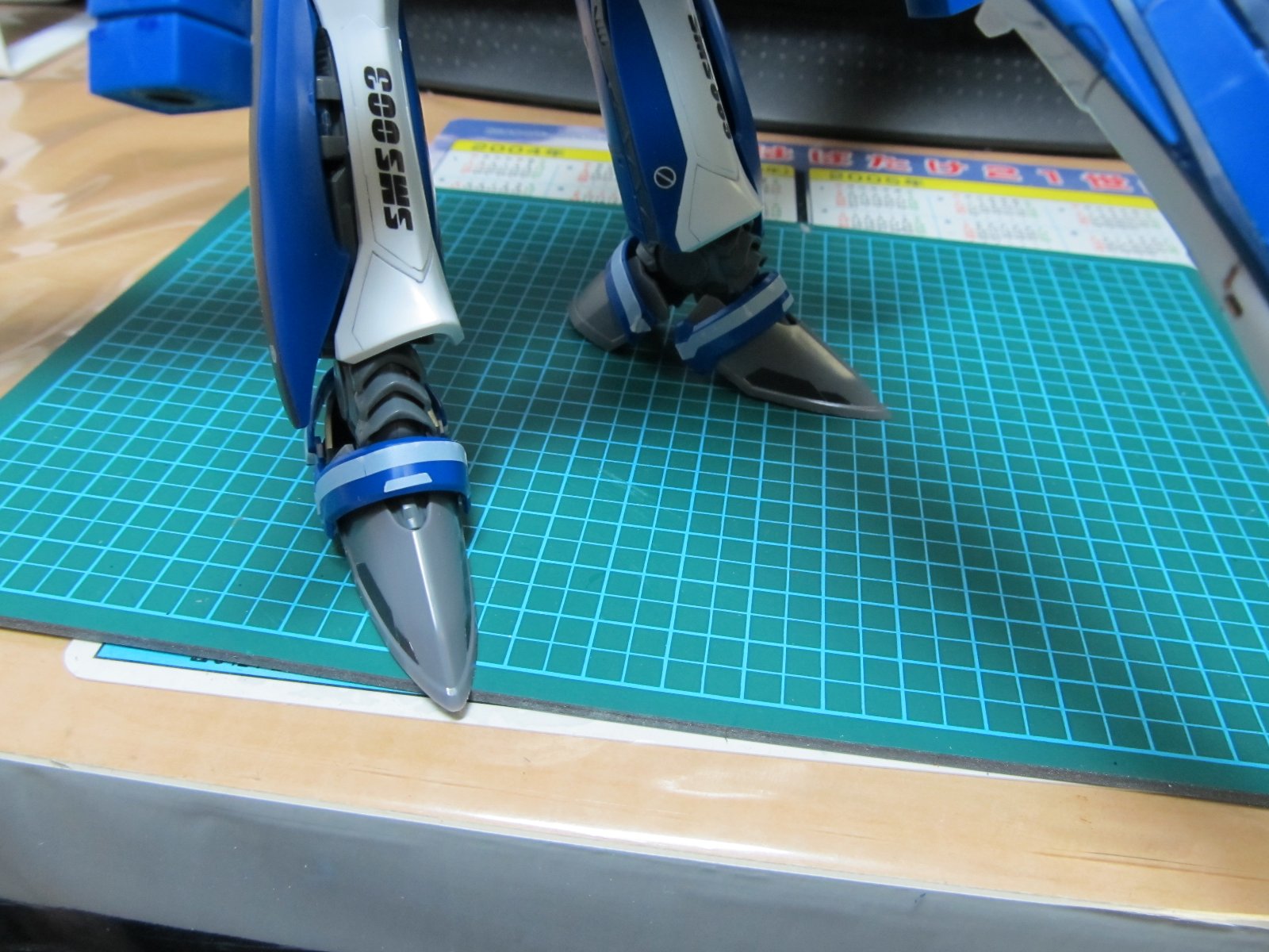 | 重い腰を上げて、組み立て開始です。実に2年ぶり(笑)連結部分の青いパーツはガンダムマーカーの白で塗っています。スミイレはリアルグレーです。 | |