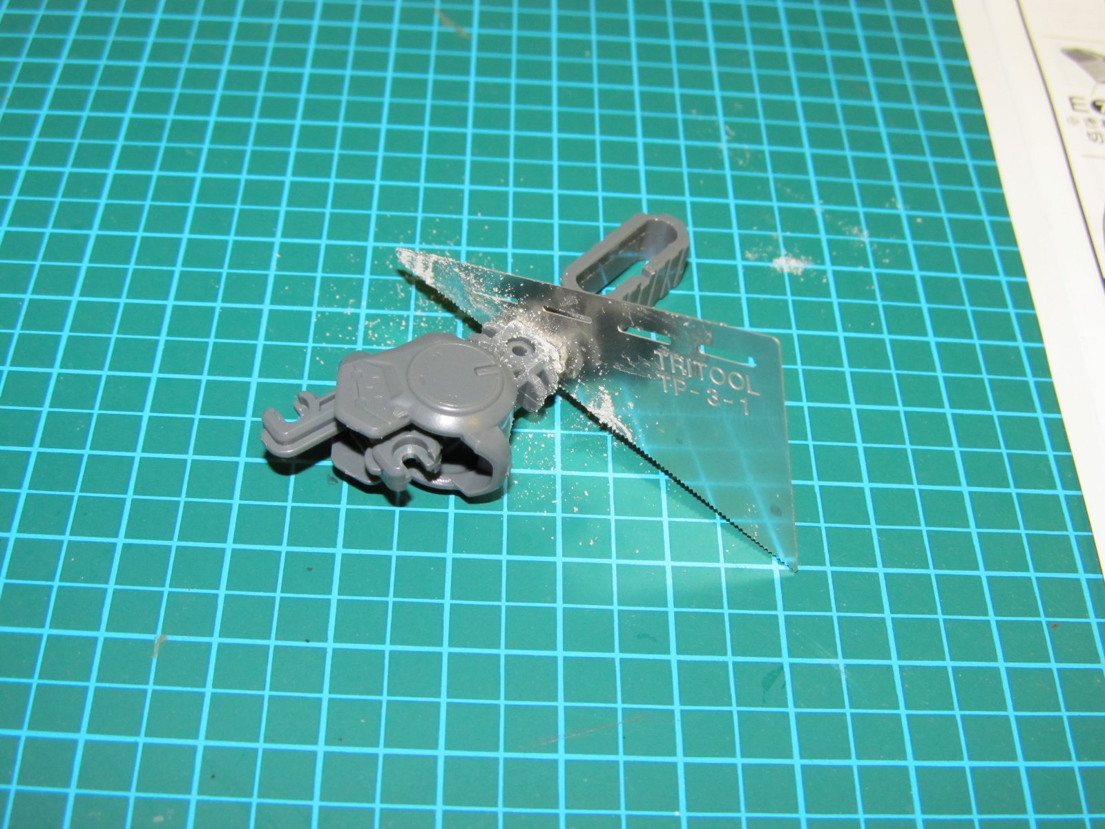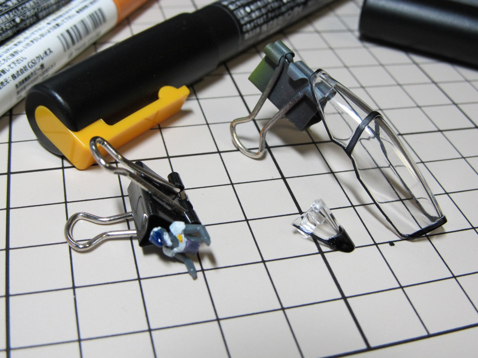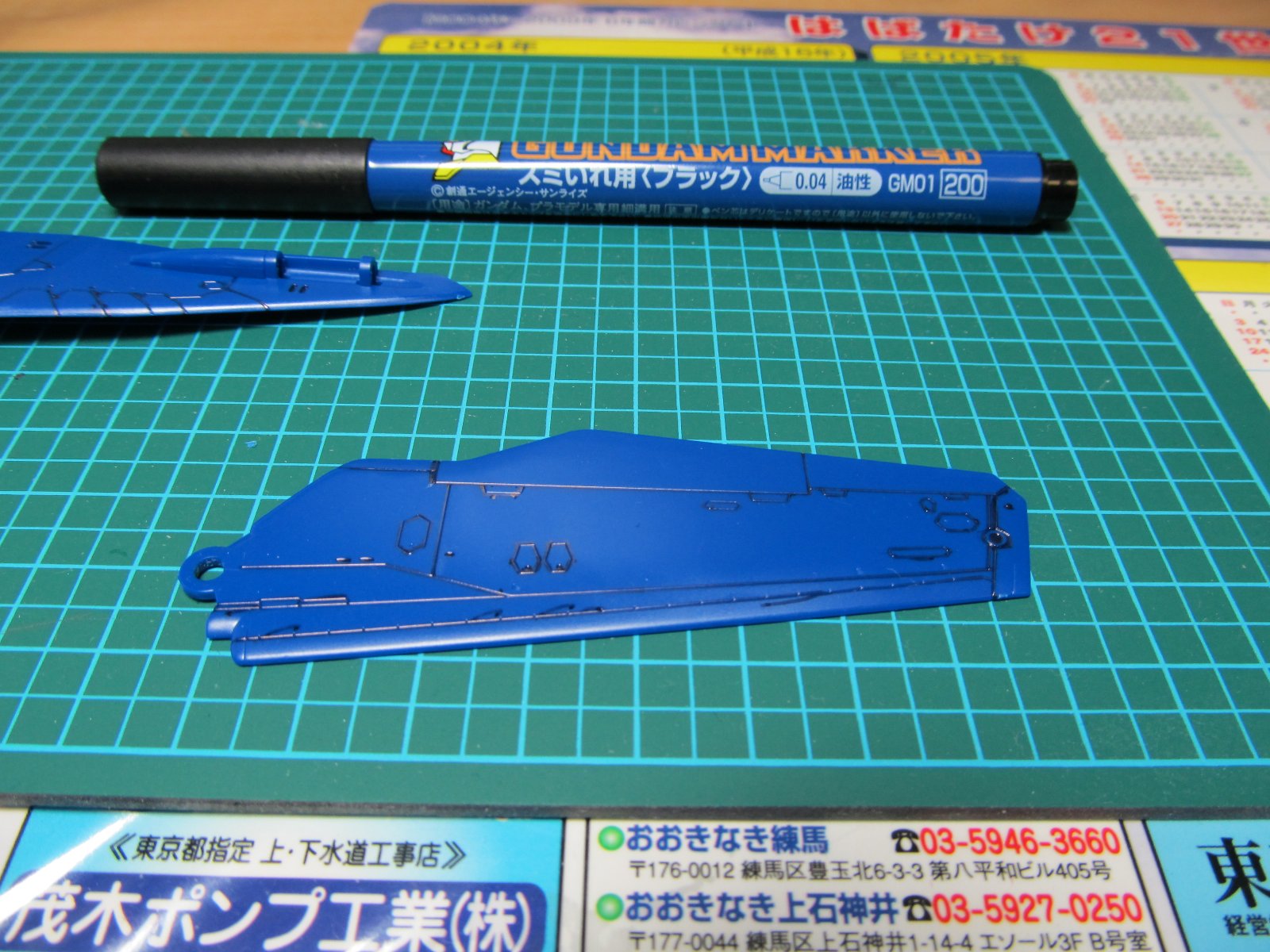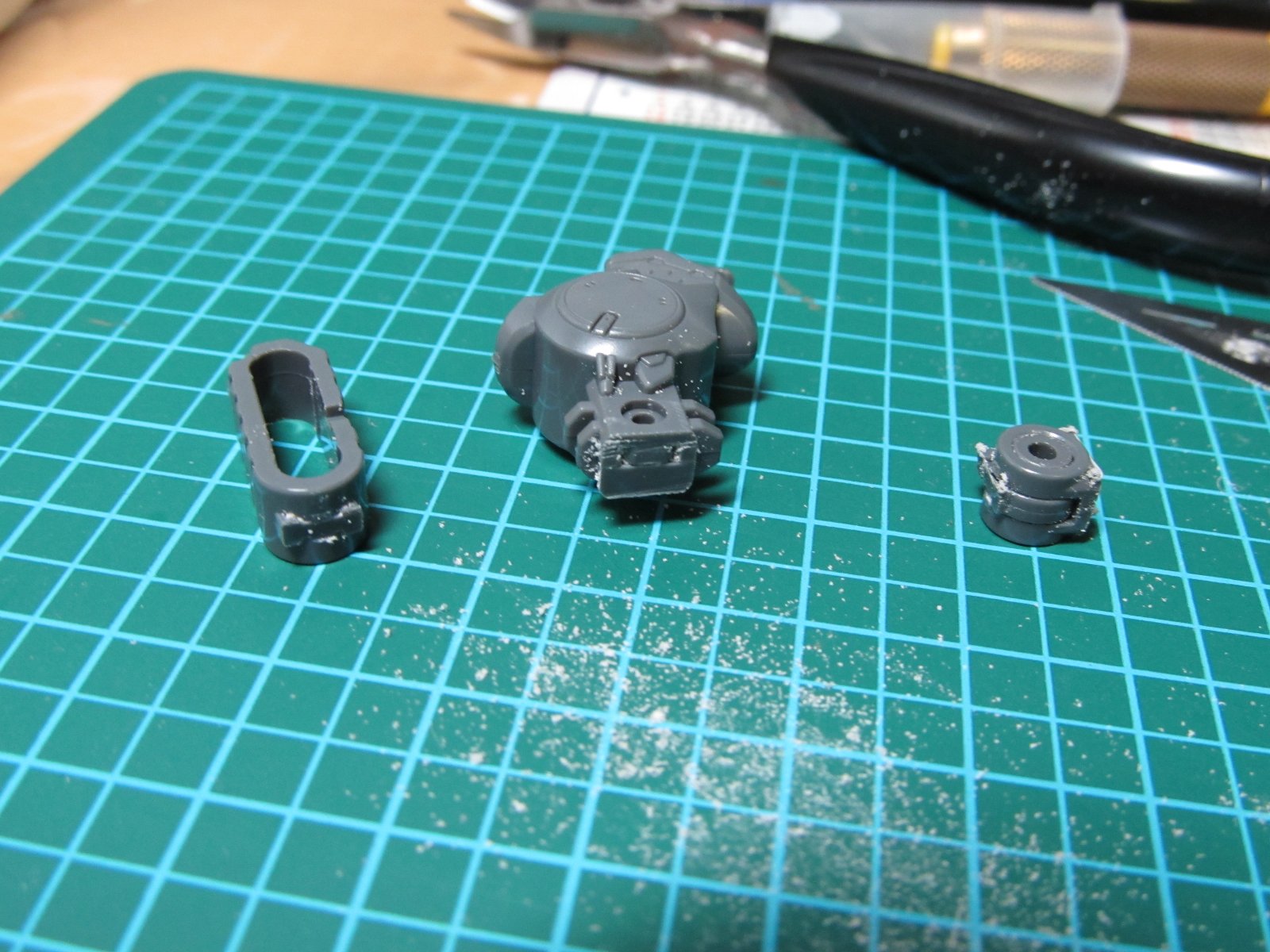 | 重い腰を上げて、組み立て開始です。実に2年ぶり(笑)連結部分の青いパーツはガンダムマーカーの白で塗っています。スミイレはリアルグレーです。 | |
