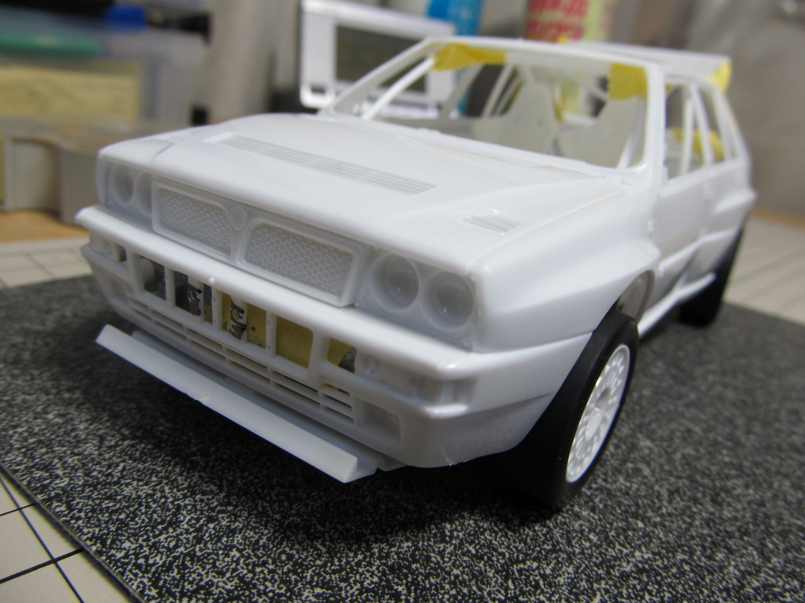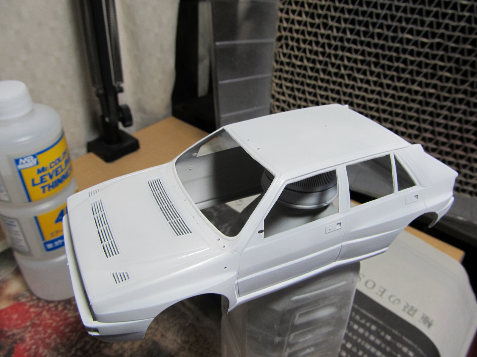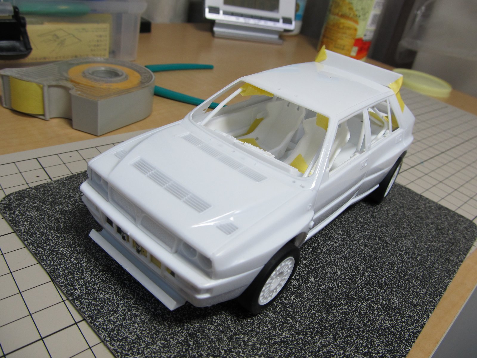ボディの表面処理がやっと終了したので、サフを吹きます。このデルタは金型が古いからなのか、意外と表面処理が大変です。