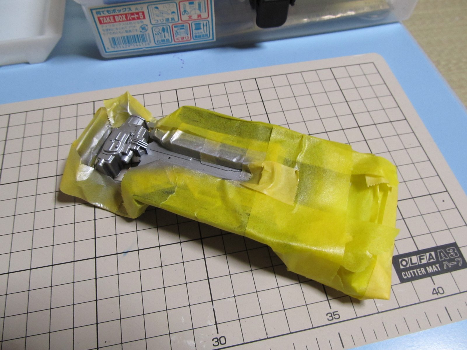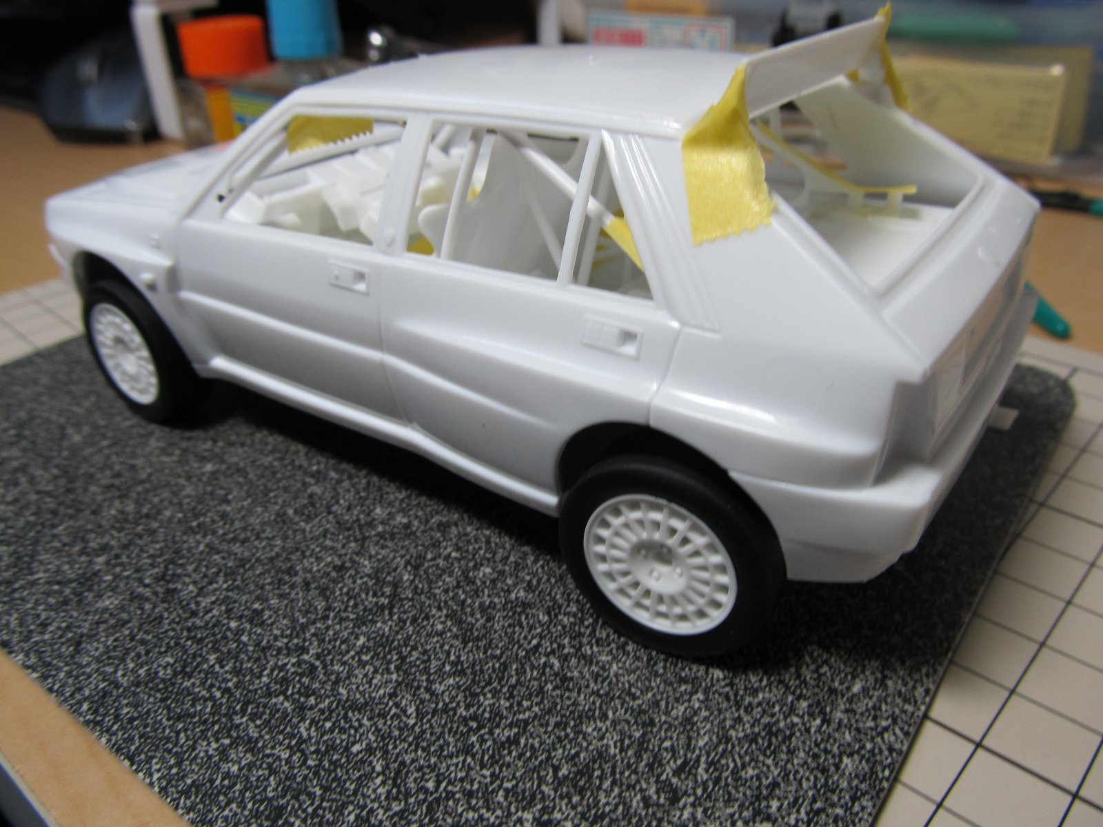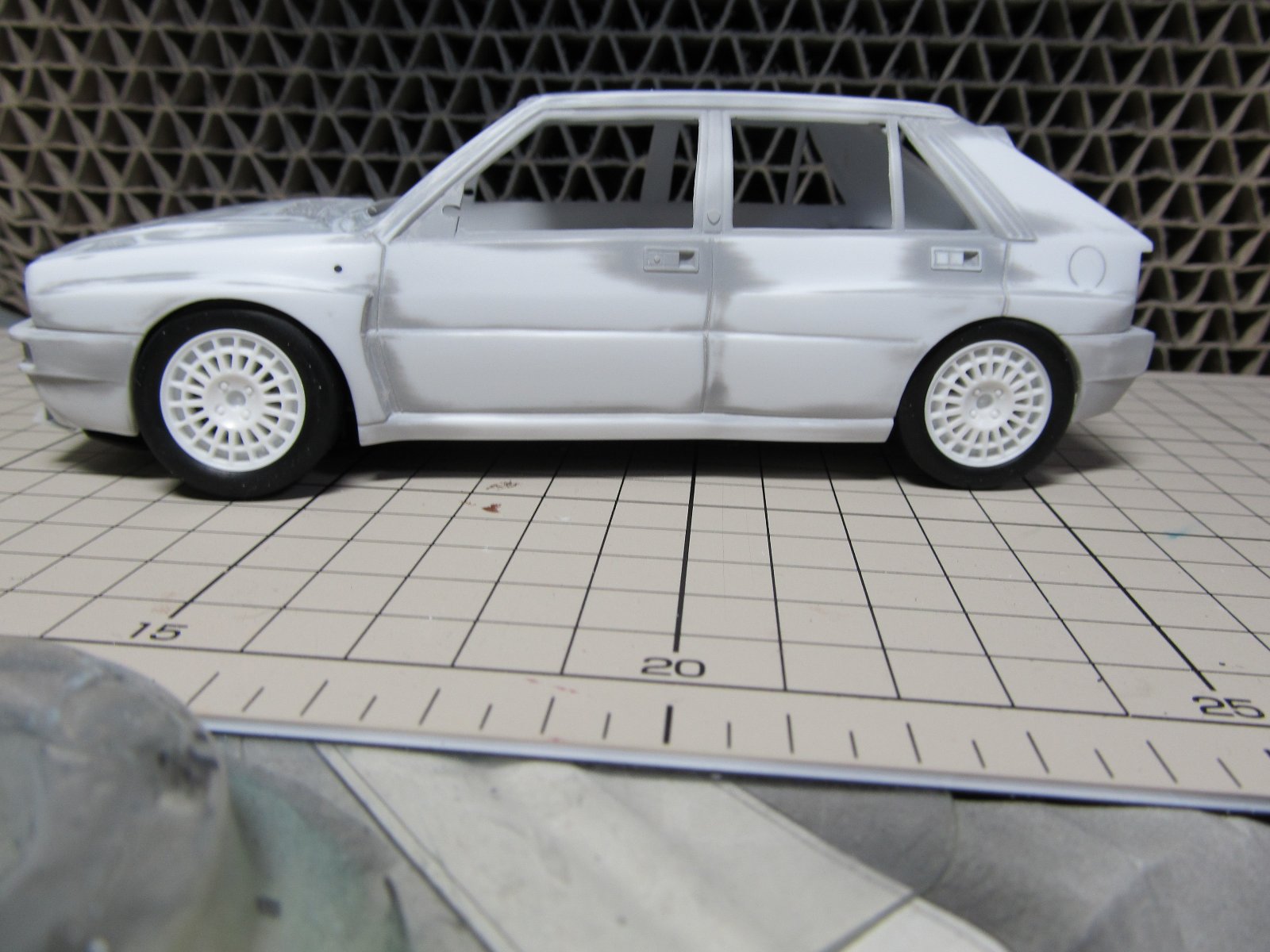 ボディの表面処理がやっと終了したので、サフを吹きます。このデルタは金型が古いからなのか、意外と表面処理が大変です。