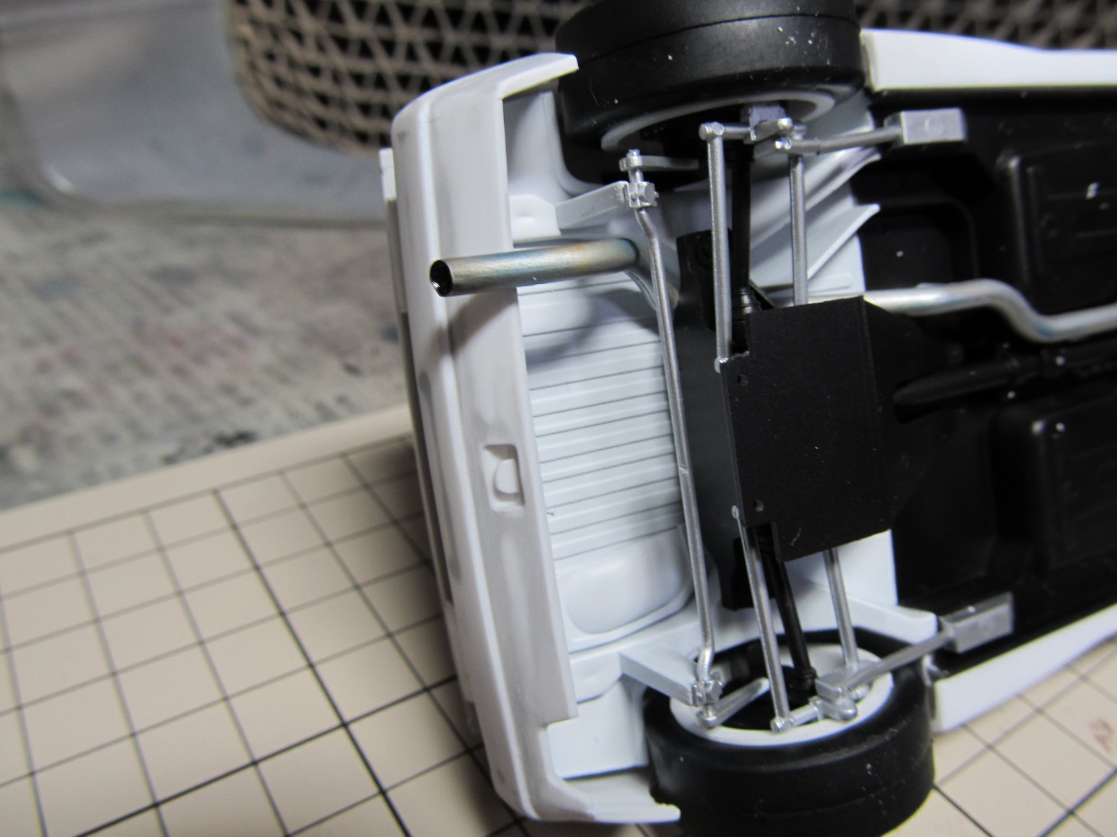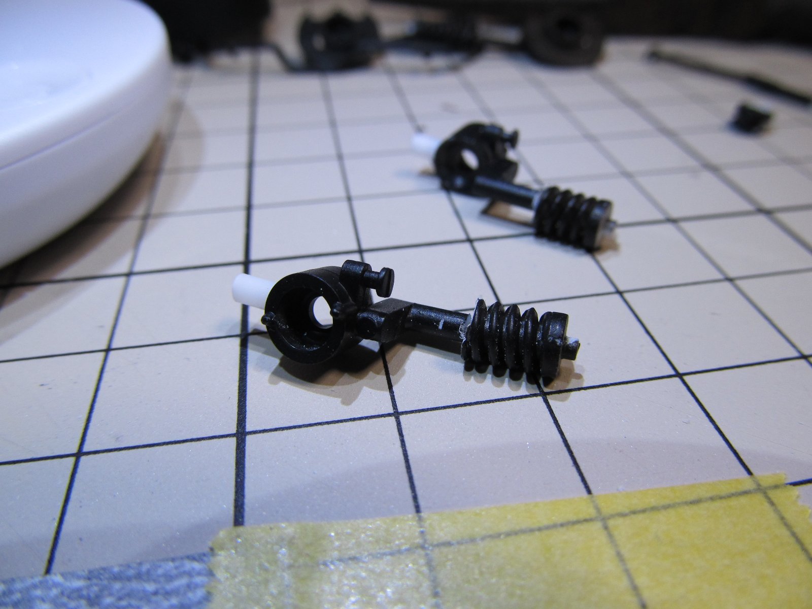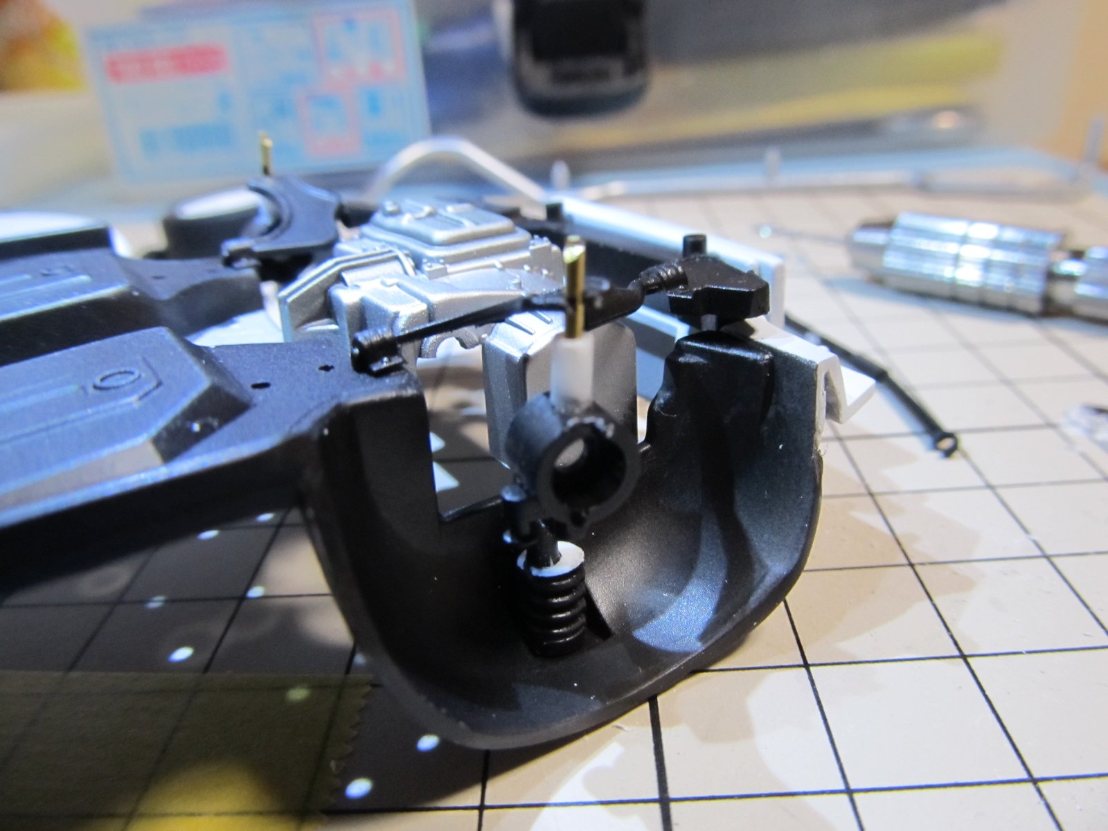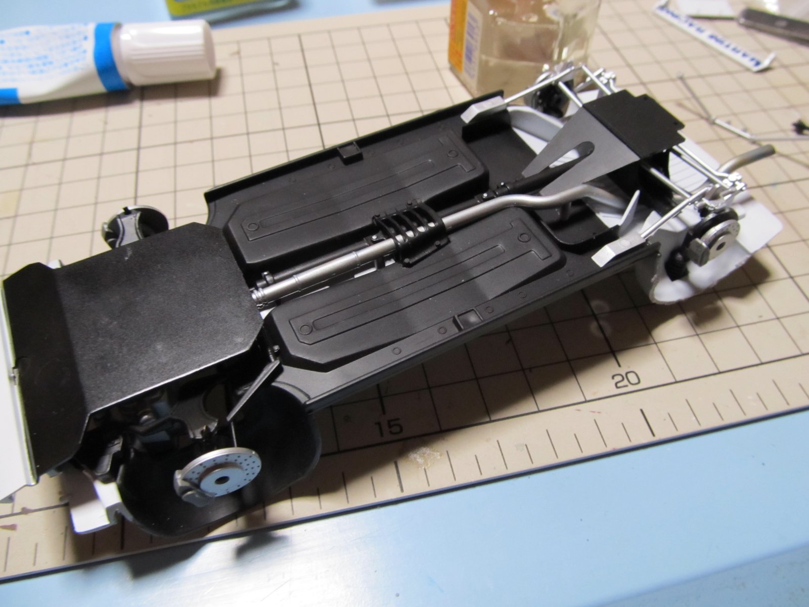 仮組み時から気になっていた車高を下げます。結局、前後とも4mm下げました。サスペンション部分で切断し、1mmの真鍮線入れておきます。下駄は手持ちにあった2mmプラ棒を利用しました。