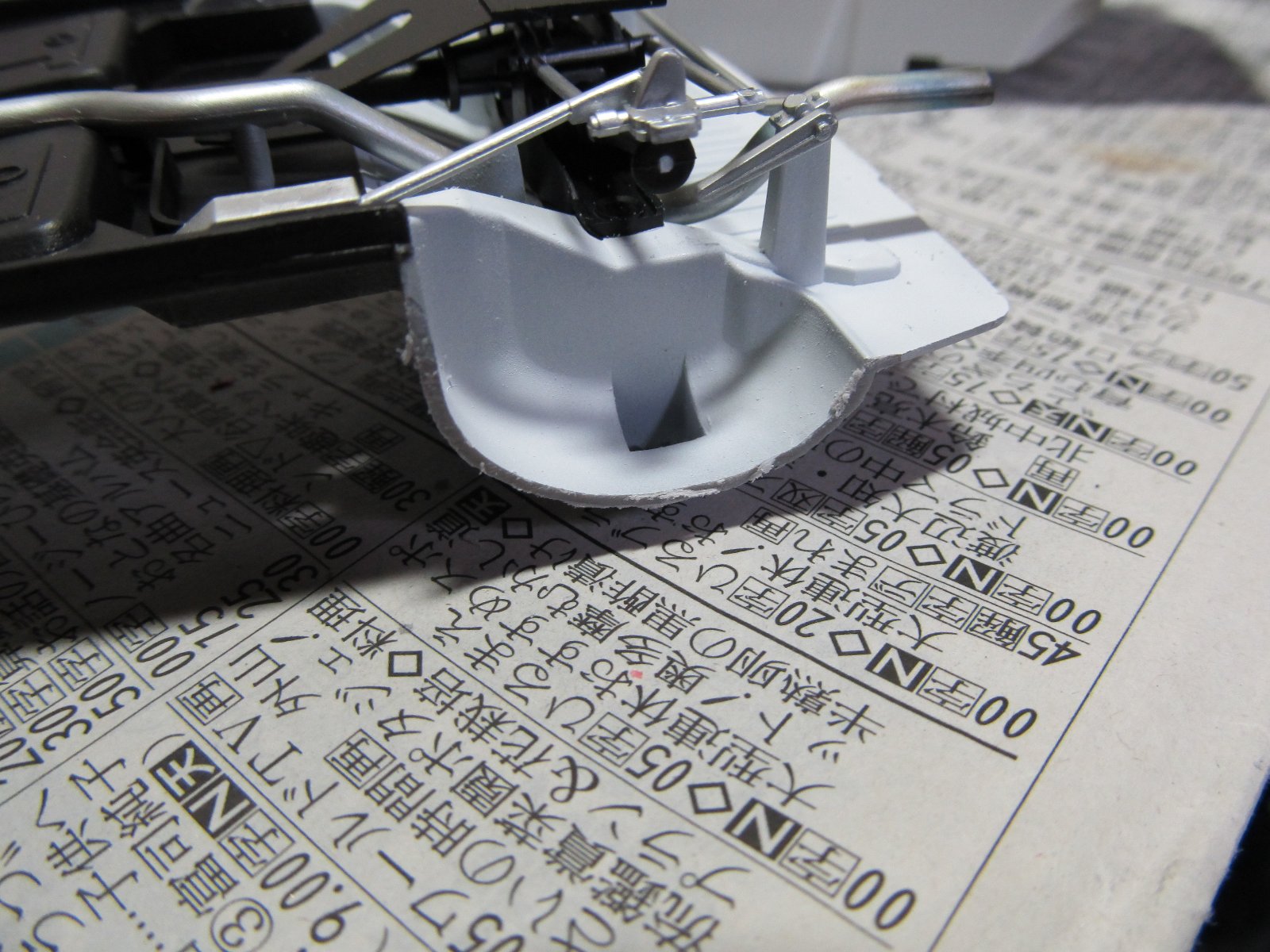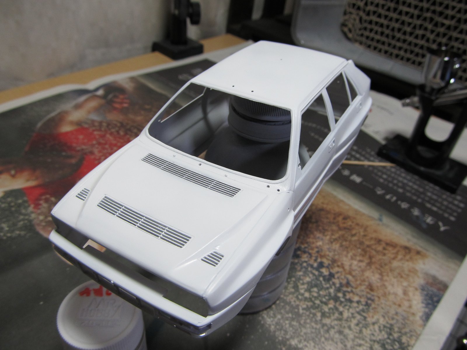 クールホワイトを吹きましたが、ボンネットなどがかぶっているので1500番のペーパーを当てました。コンパウンドで中とぎしてから、もう一度クールホワイトを吹いたほうが良さそうです。