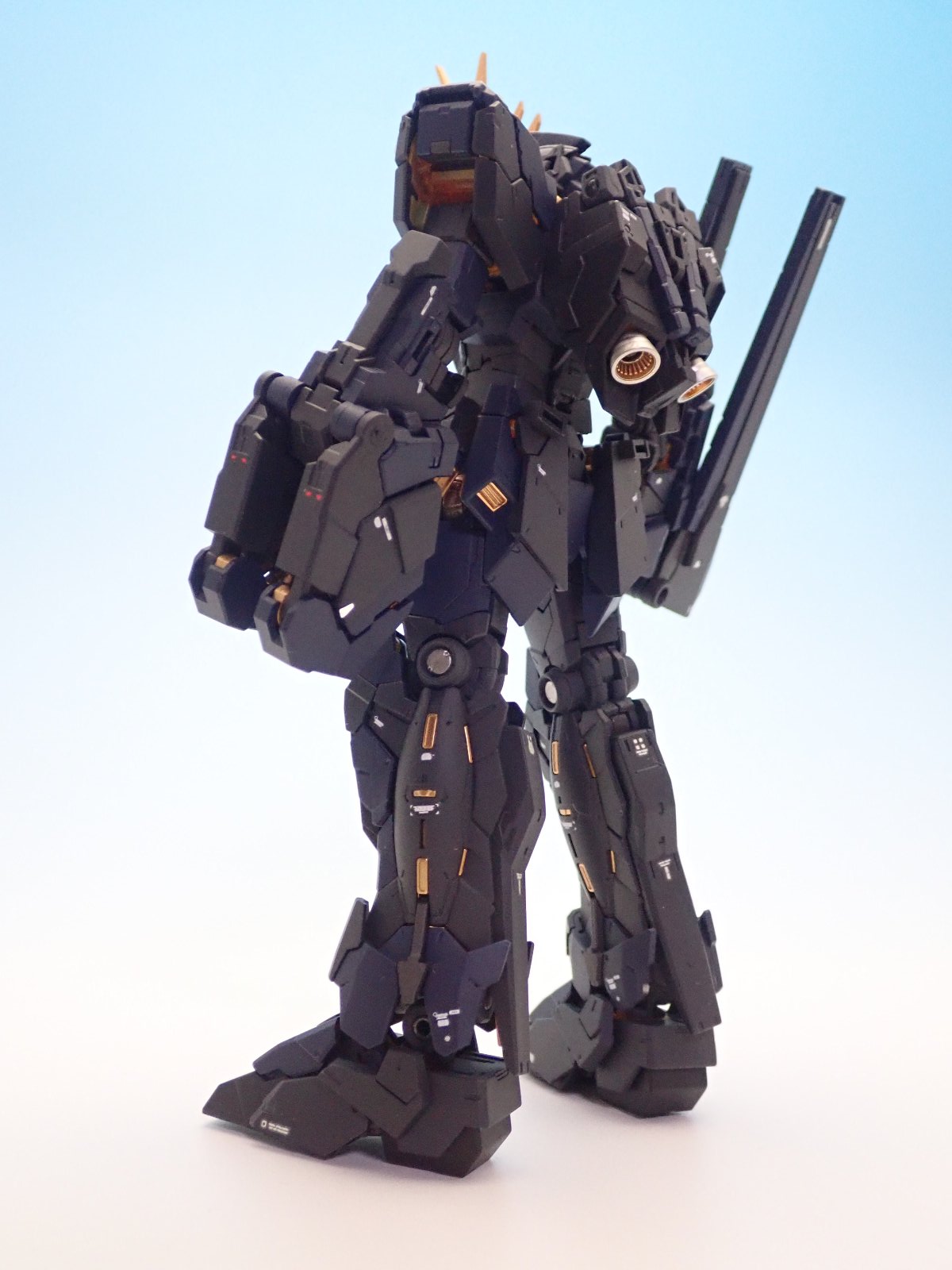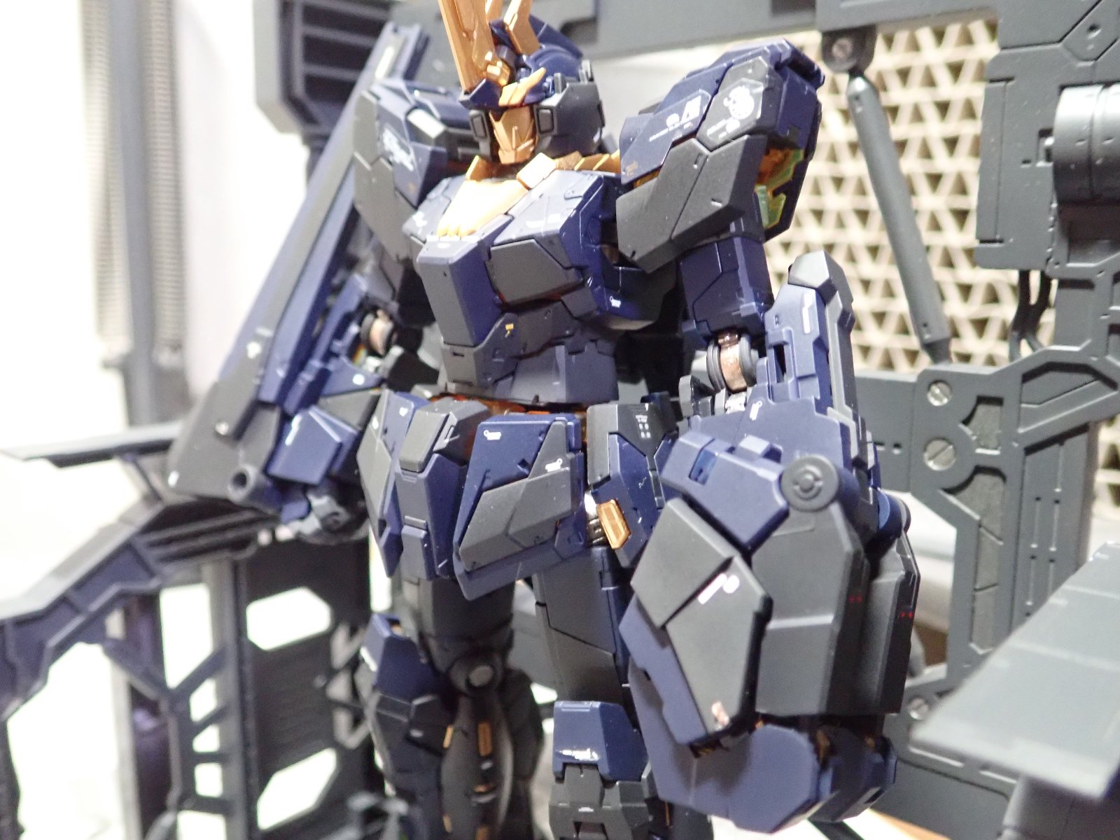 写真を撮りました。何個もRGユニコーンは作っているので感想も無いのですが、やはり紺塗装は締まります。肩のデカールのみRGのステッカーを利用しましたが、近くで見ると目立ちますね。なんにせよマリーダ用バンシィが作成出来て良かったです。
