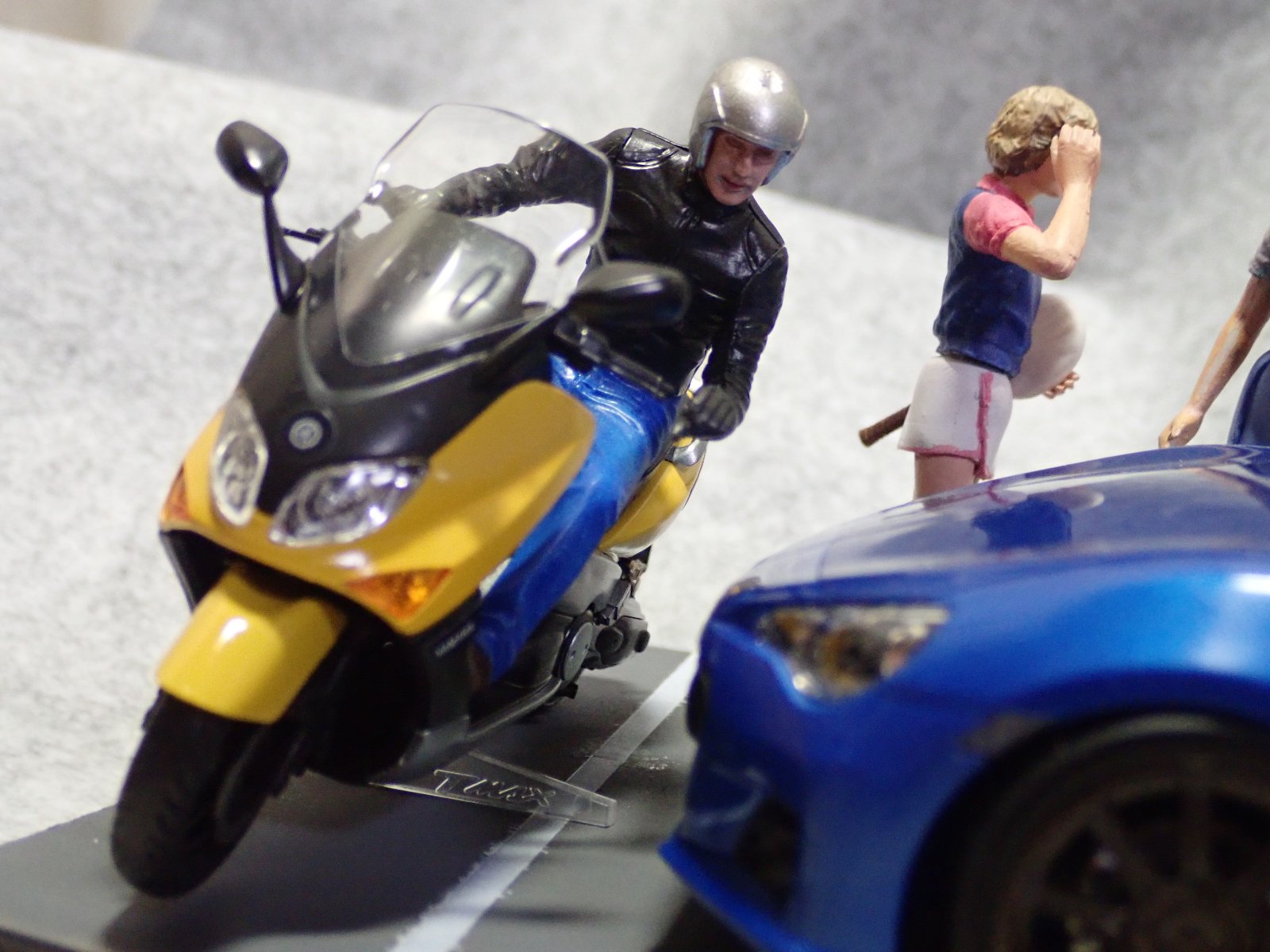 無意味に全員集合写真です。フィギュアはタミヤ キャンパス・フレンズ セットとマスターボックスのスローン&ジャッキー、バイクはタミヤのT-MAXを使用しています。