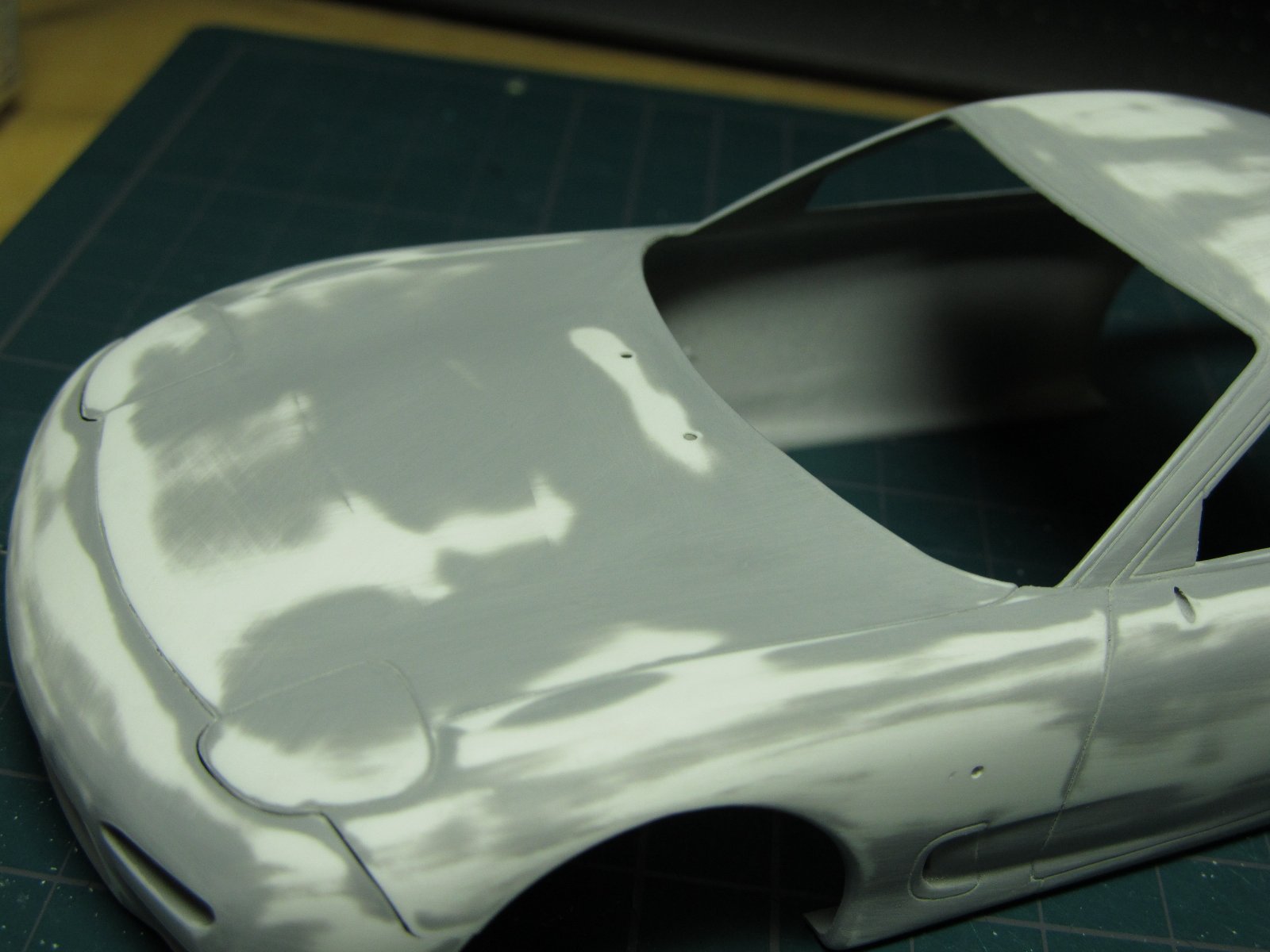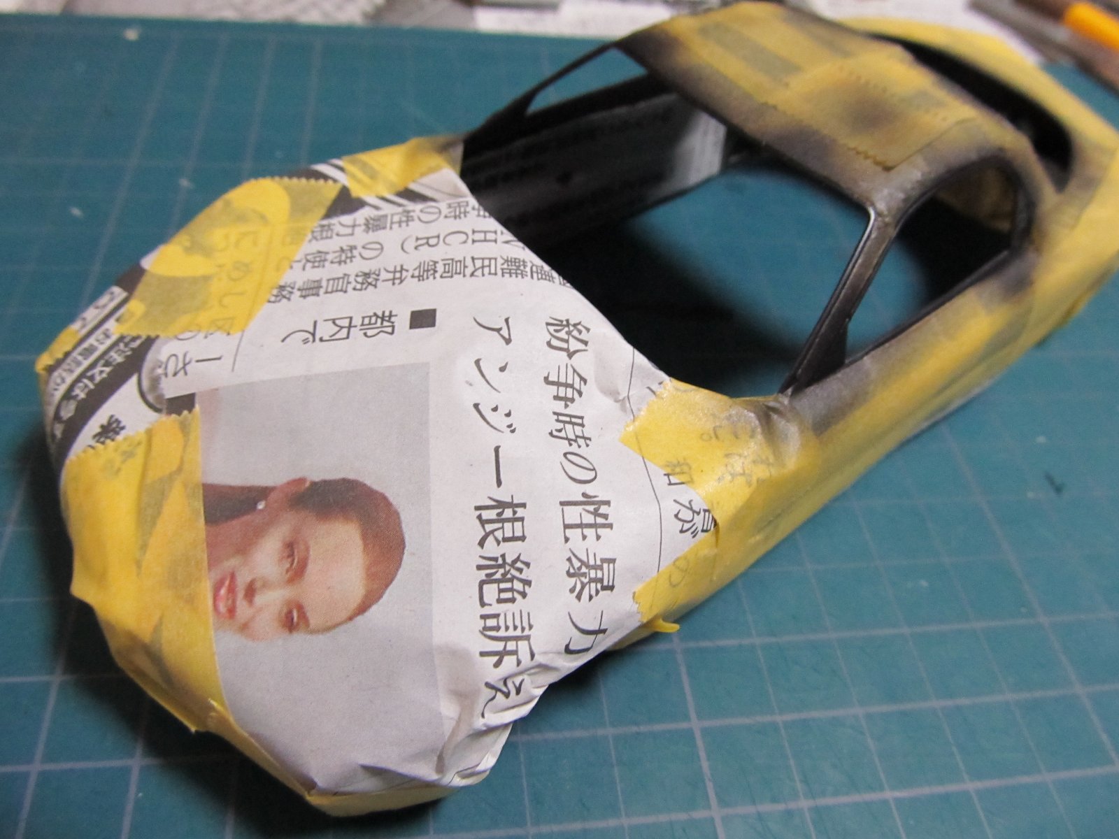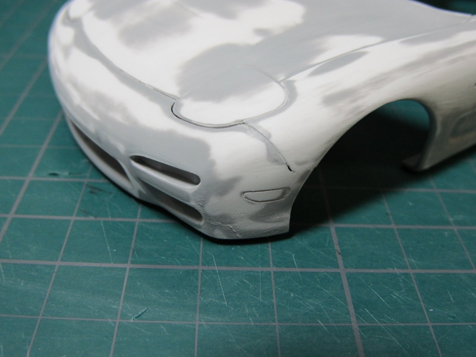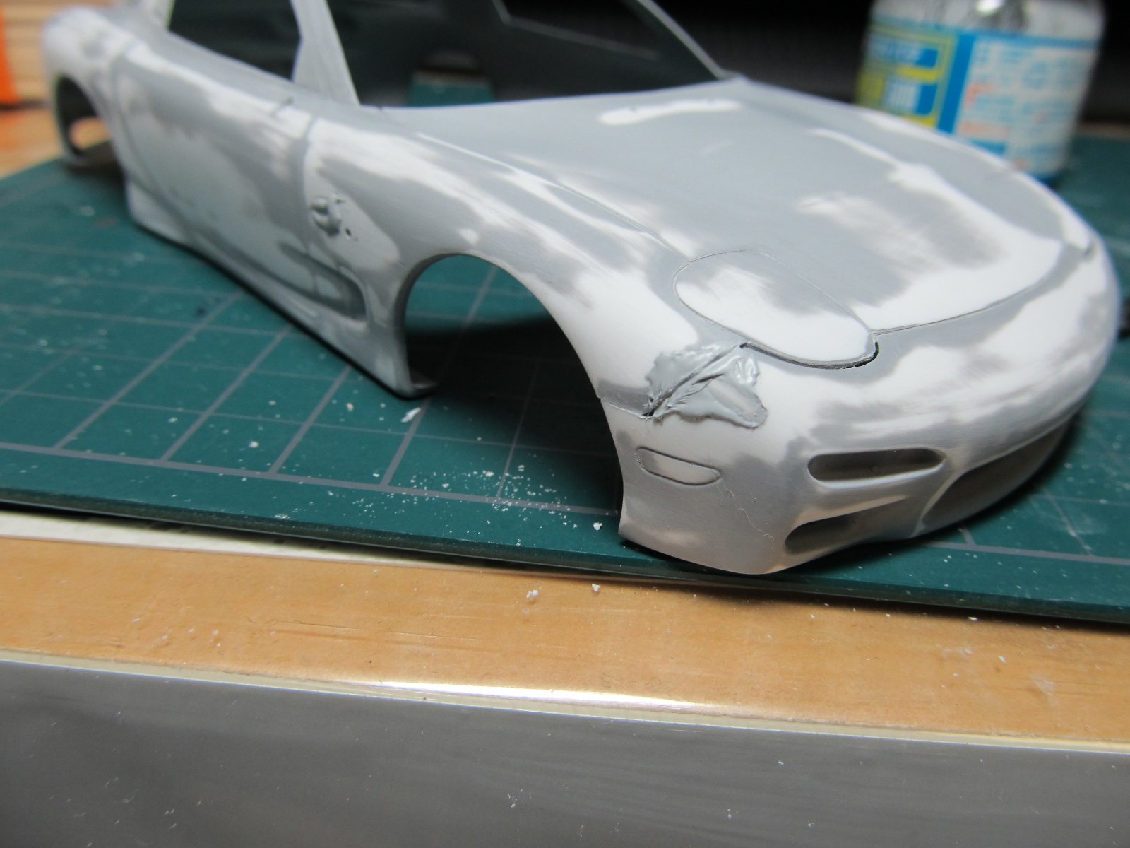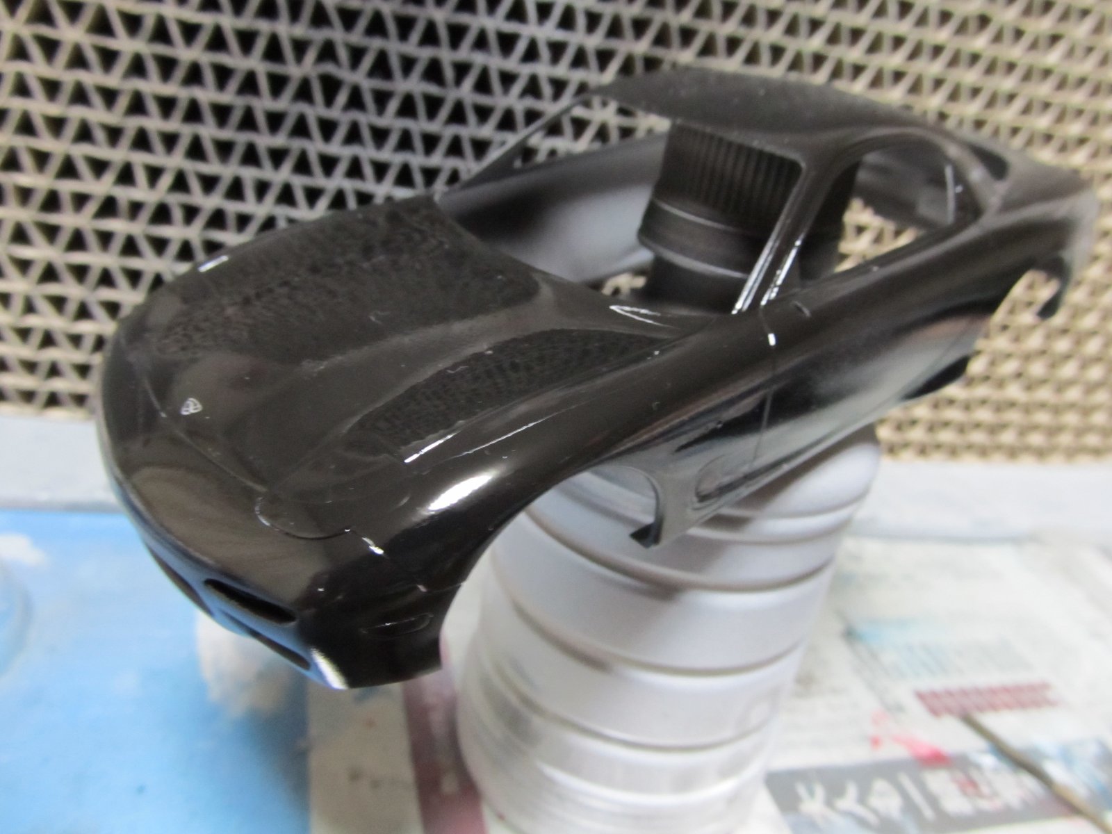 この前購入したプロコンBOY LWAを利用しました。エア缶でやってみましたが、持続性がないのでカーモデルの塗装は厳しいかな?その後、中砥ぎをしました。本当はボディ色まで塗装しようと思っていましたが、エア缶では面積が広すぎて無理ですね。缶スプレーなら良いかもしれないけど。