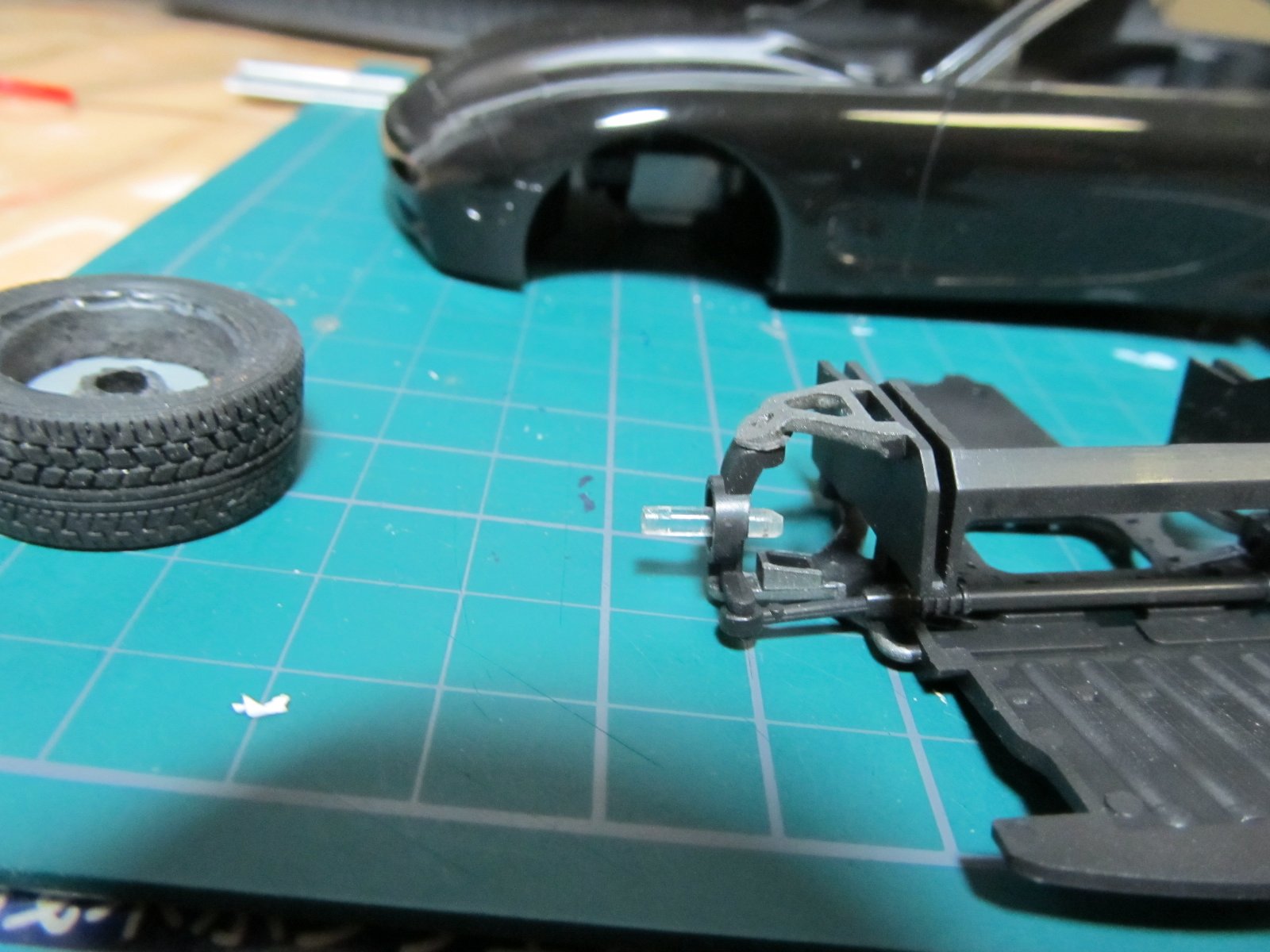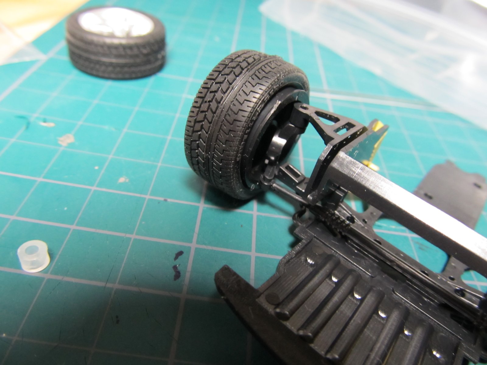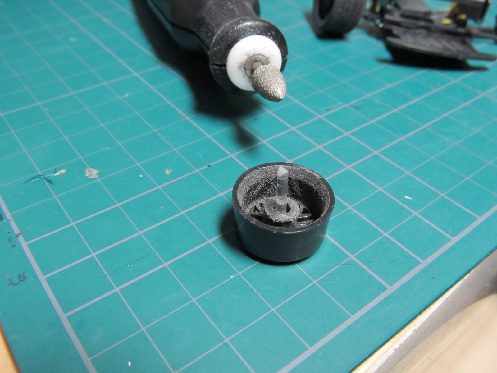 しかし、ホイールが干渉するので、ちょっとずつ削っていきました。ちなみにシャフトにしているのは透明プラ棒2mmです。軟質プラなのでちょうどはまります。
