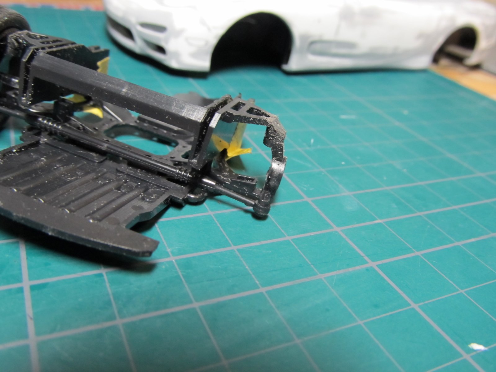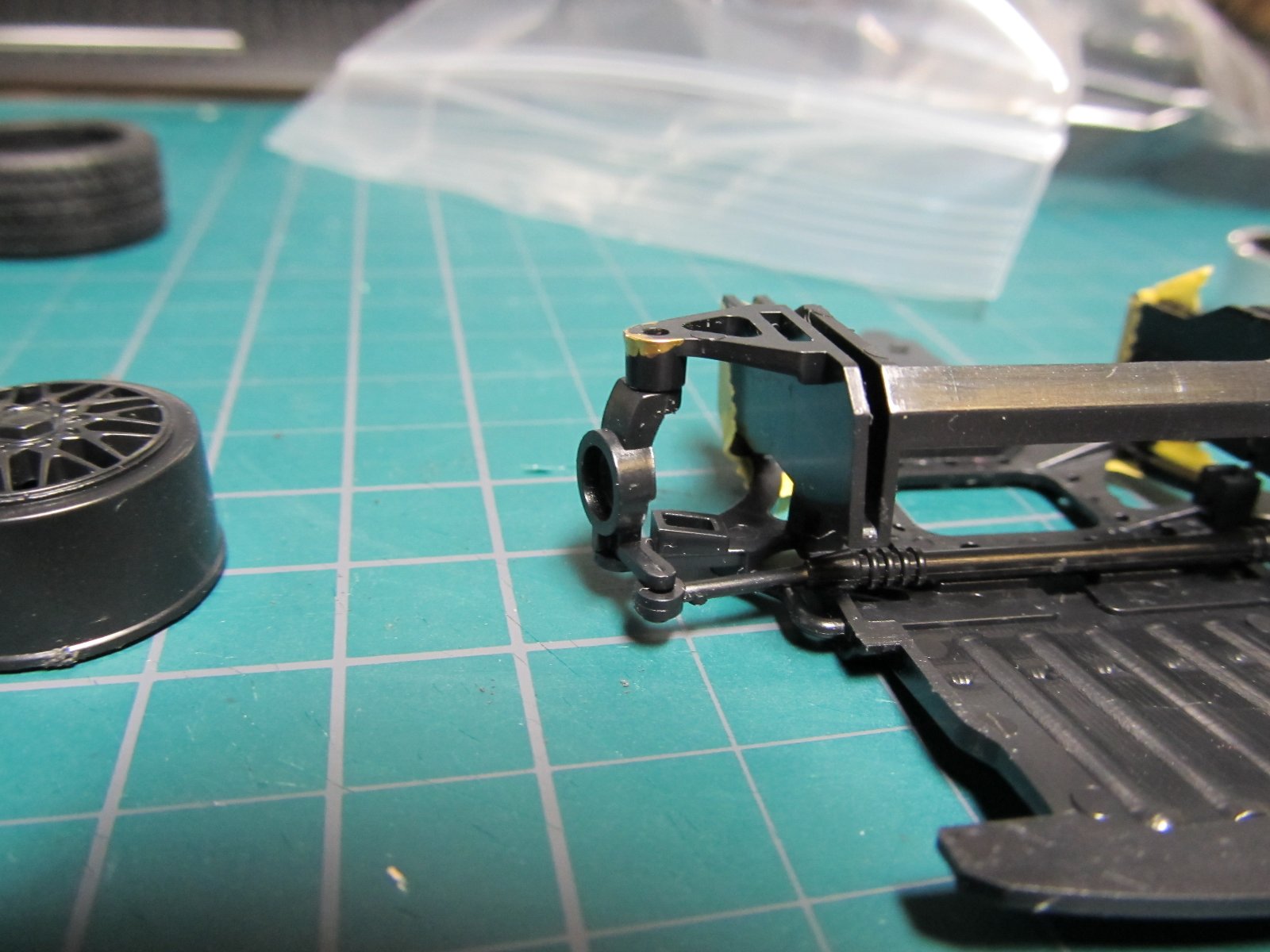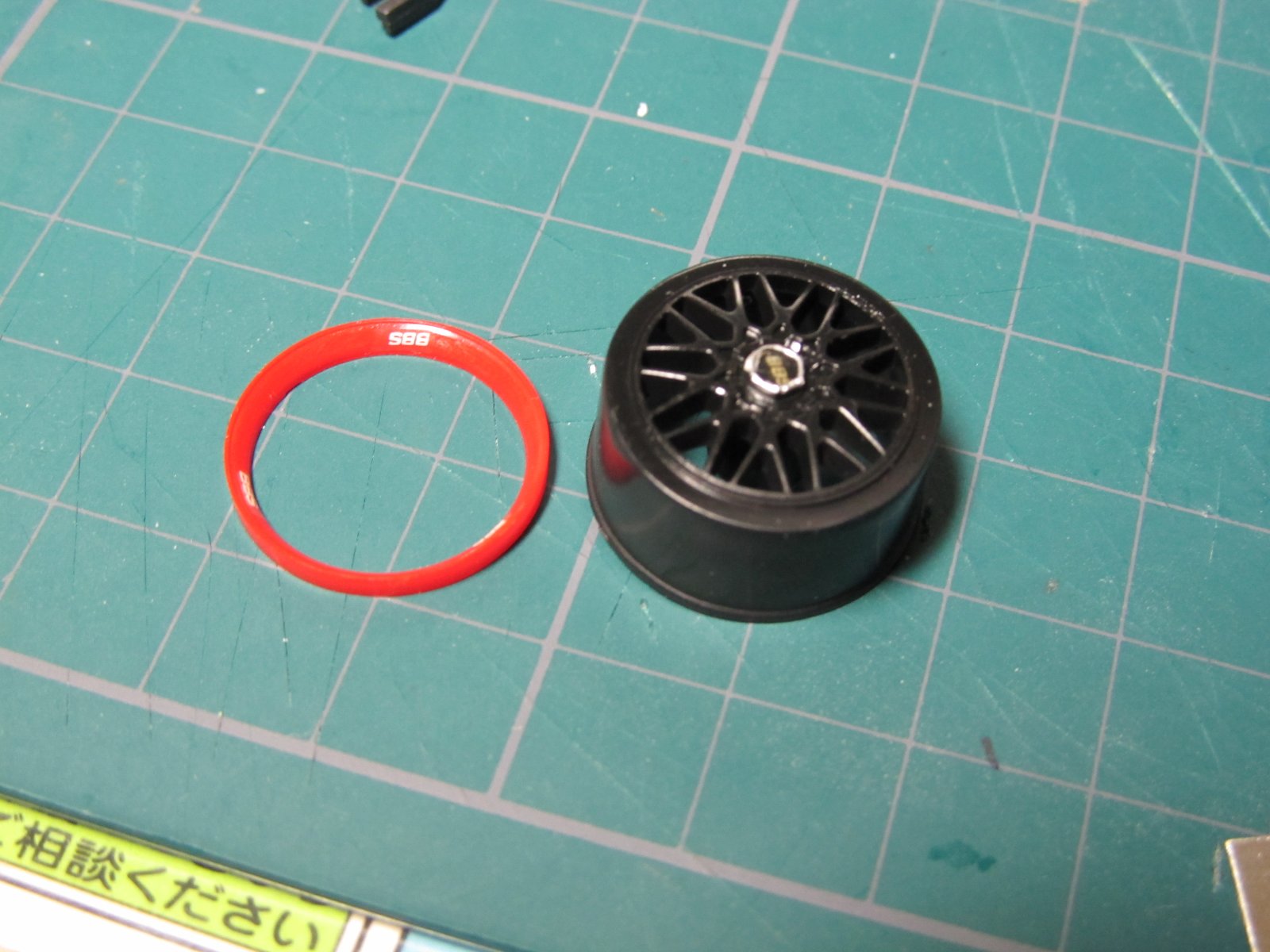 取り付け方法だけではなく、大きさも合いません。付属のホイールはステア部分がホイール内にすっぽり入るのですが、フジミのBBSは当たって入りません。当然、車体からはみ出します。