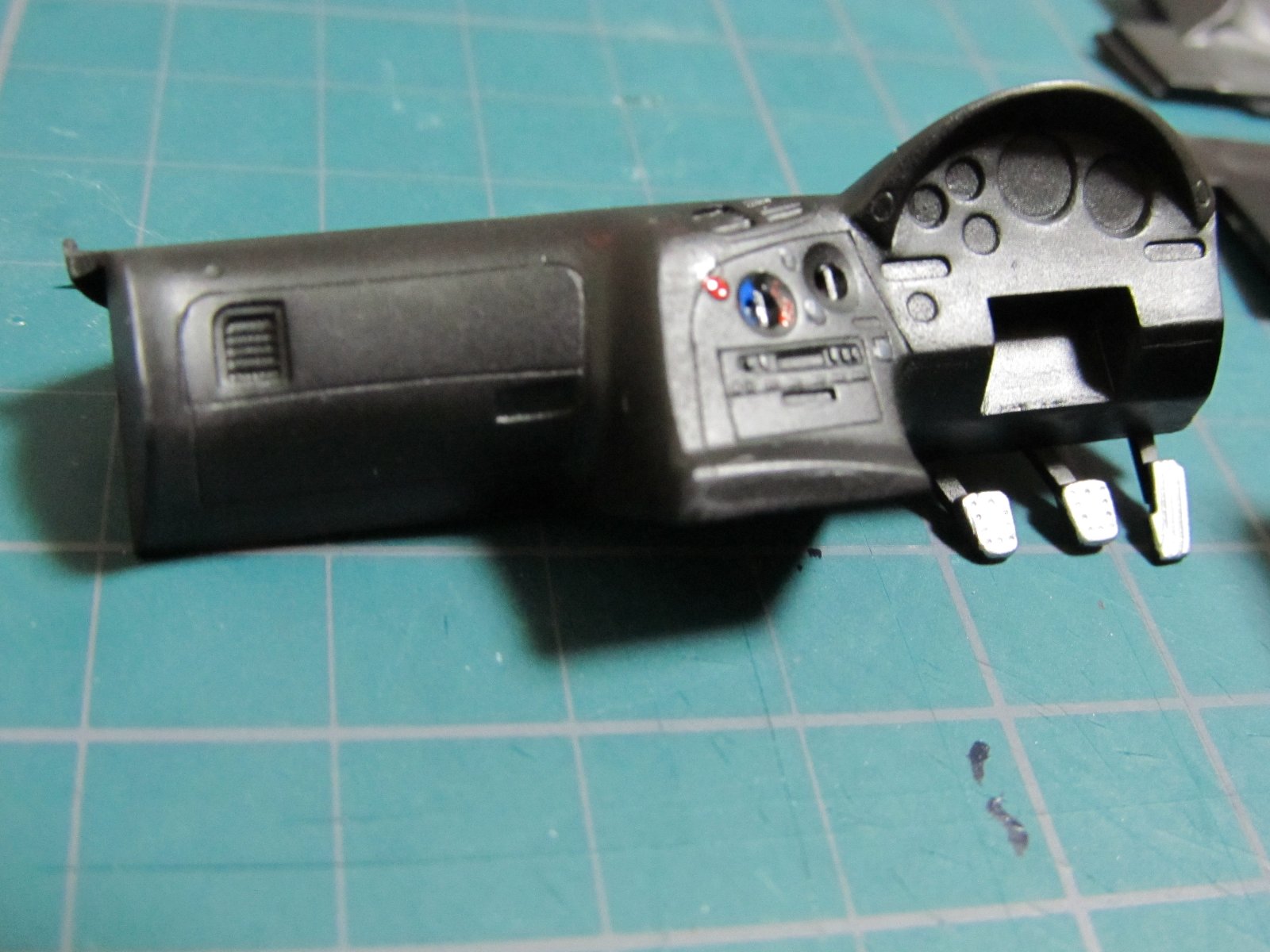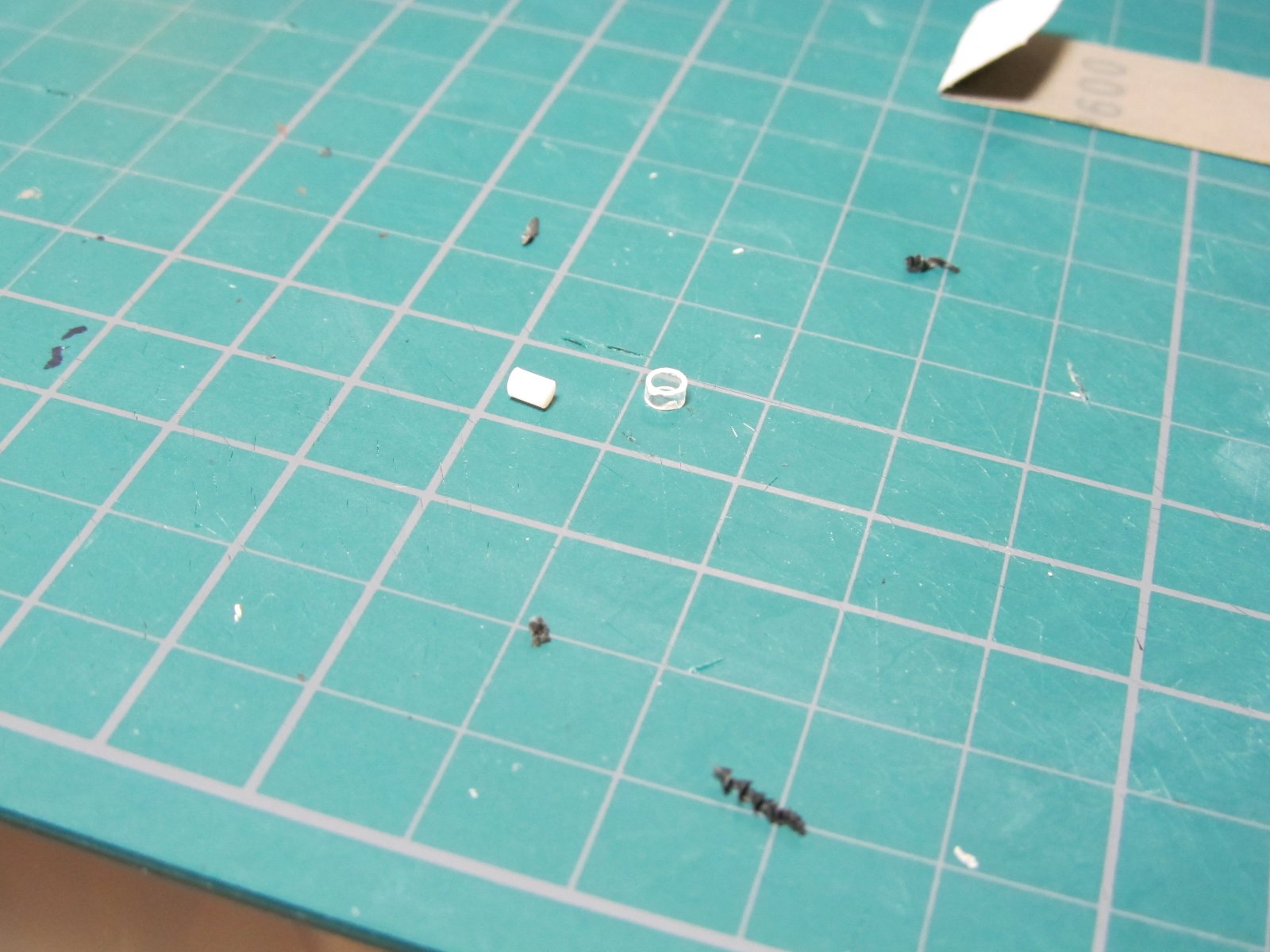 追加メーターを作ります。3mmプラパイプと2mmのプラ棒の組み合わせです。それに0.5mmの真鍮線を挿してダッシュボードに結合します。それっぽい大きさではないでしょうか?