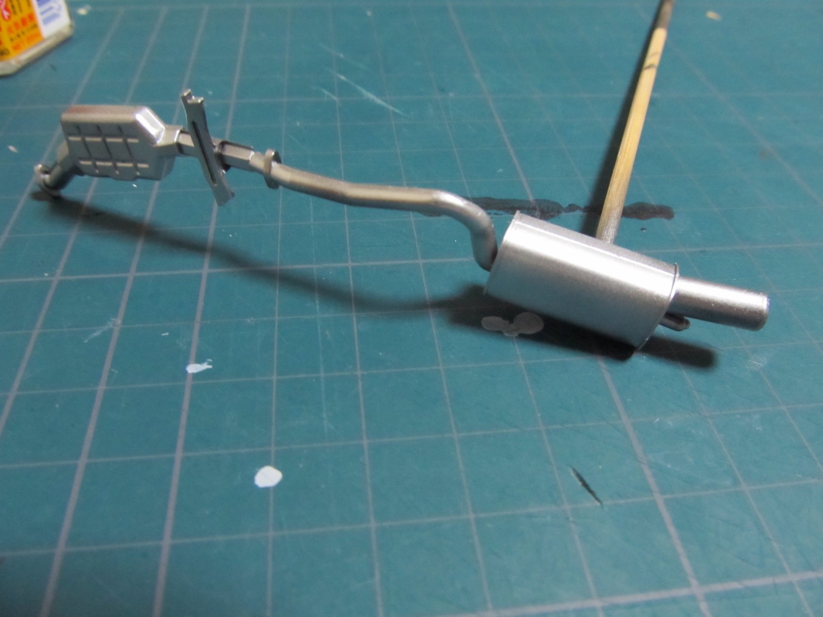 マフラーを塗装します。ウィノーブラックを塗装後にクレオスのスーパーメタリック クロームシルバーを塗装しています。初めて利用しましたが、非常に綺麗な光沢が出ますね。塗装被膜も強く触っても手につくことなどは無いです。