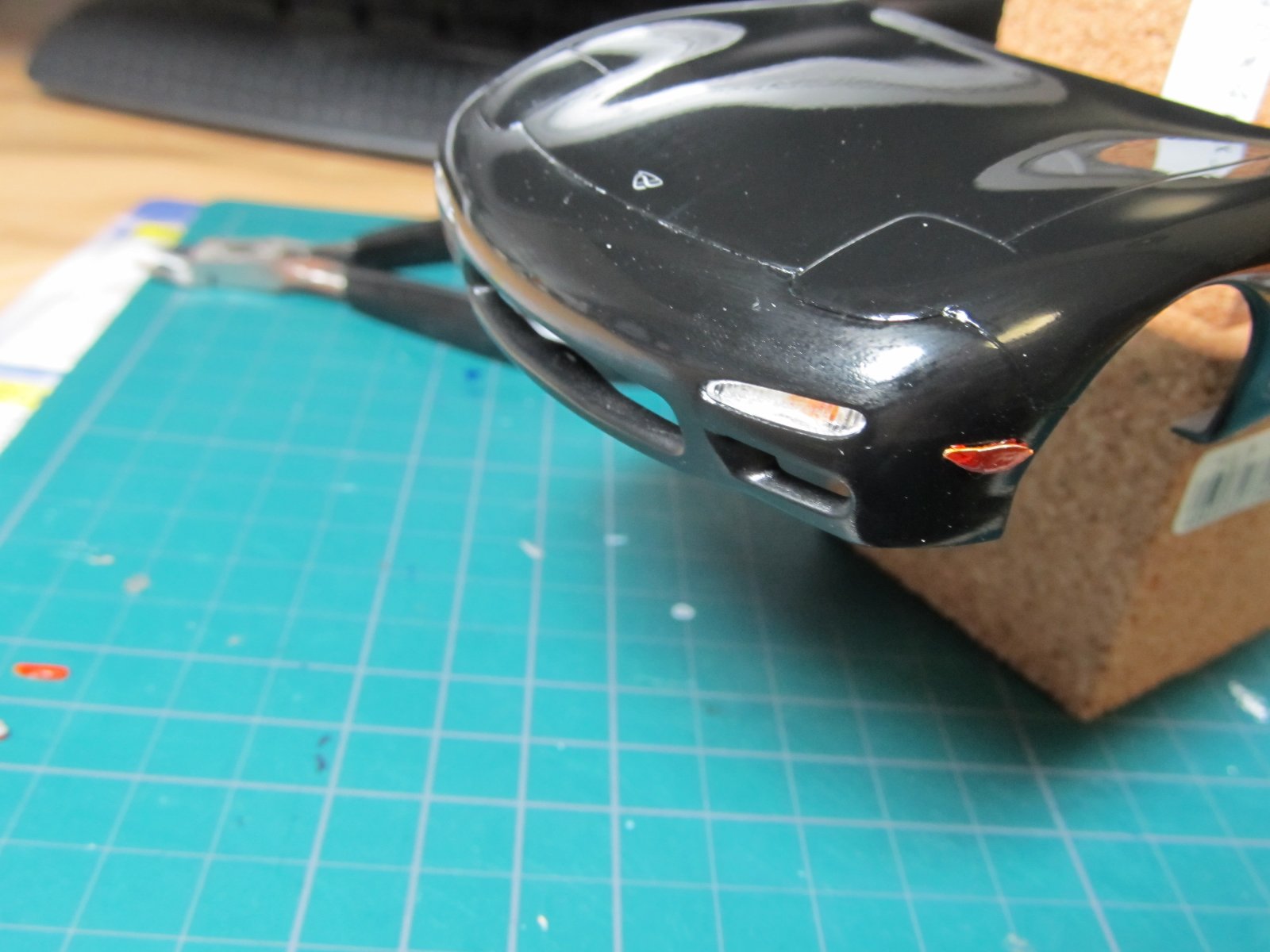 ボディ横にあるウインカーランプも削り取り、1mm穴を開けておきました。ウォッシャーノズルも削り取り、1mm穴を開けています。