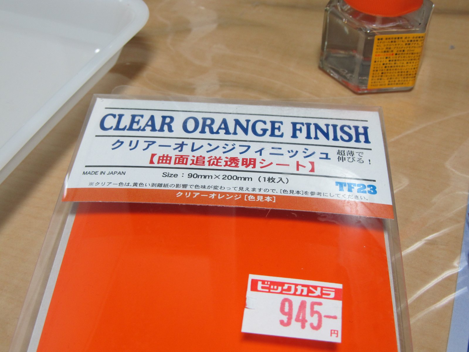 その上に今回購入したクリアーオレンジを貼り付けます。その後、切り抜くのですが、粘着力が結構ありますね。メタルック程度だと思っていたら、完全にシールの粘着力でメタルックが剥がれそうになりました。