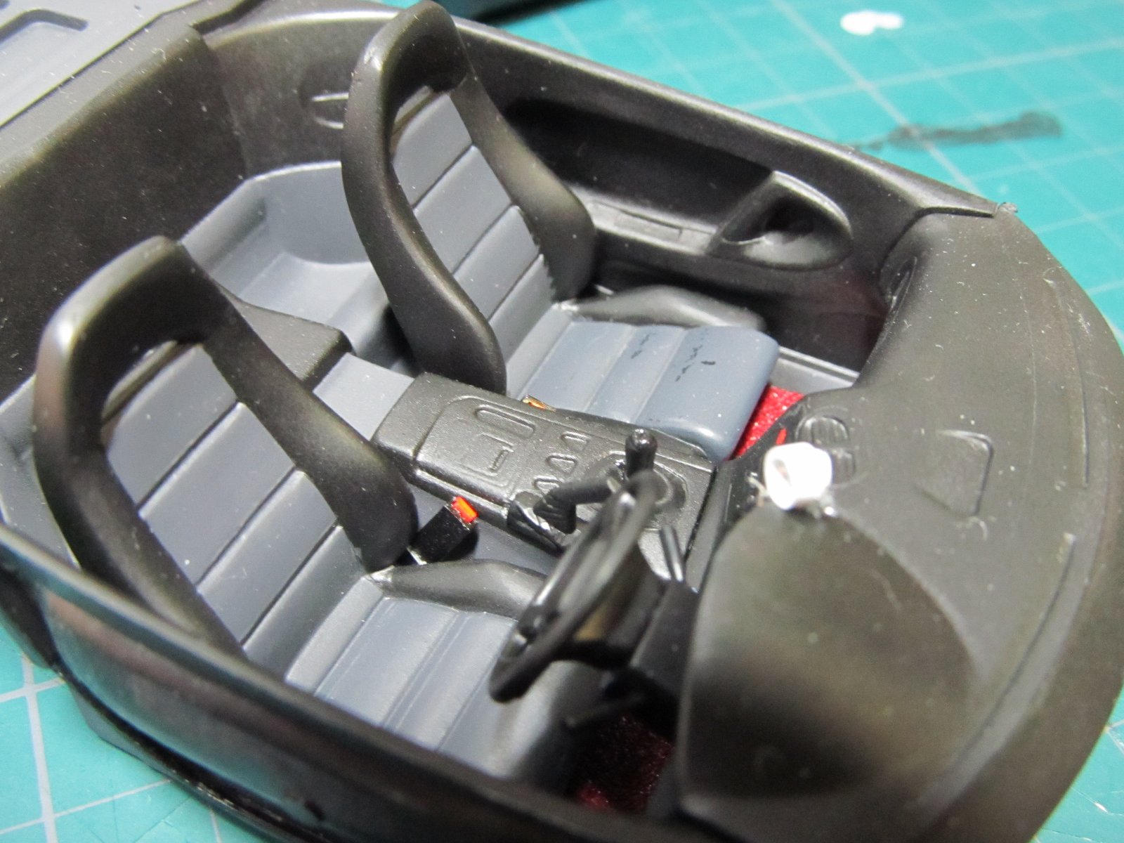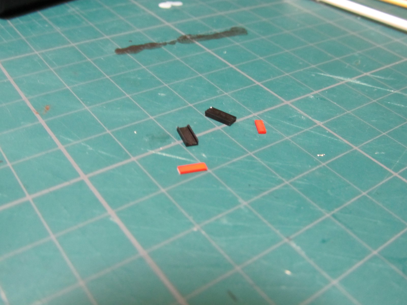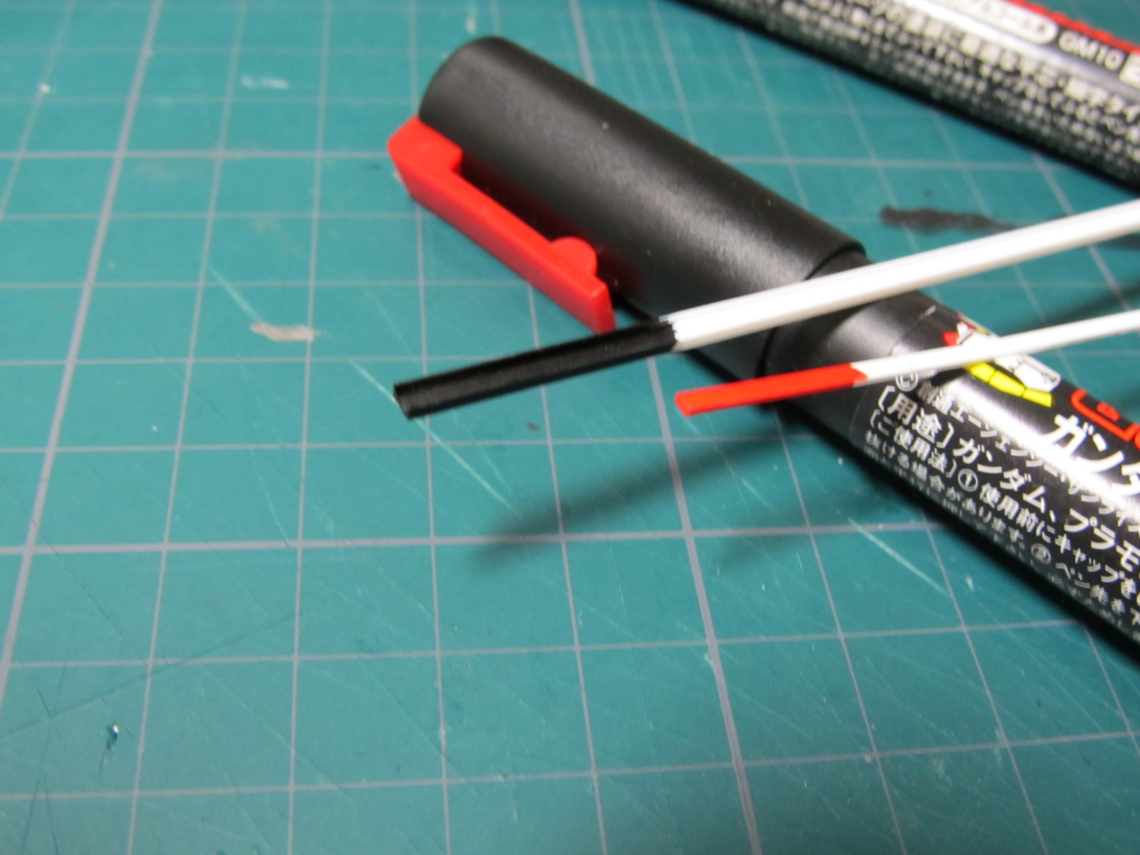 シートベルト受けを作成します。エバーグリーンのプラ材にガンダムマーカーで色を塗ります。