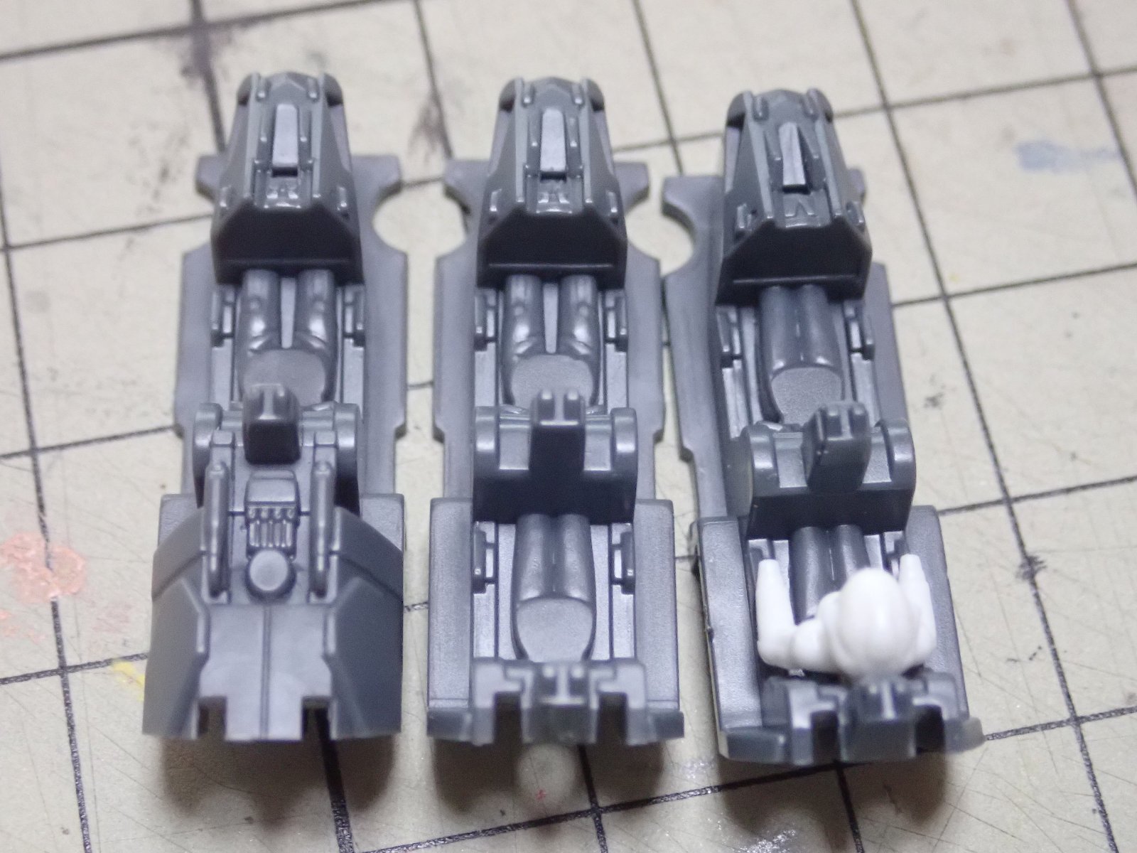 芸が細かいと思ったのは、コクピット内部が新規についてくるのですが写真の一番右が今回の新規部品、左二つは従来のVF-31の部品です。何が違うのかと思ったら、パイロットの足の太さ(座り方?)。ミラージュが女性なので専用品が付いているんですね。