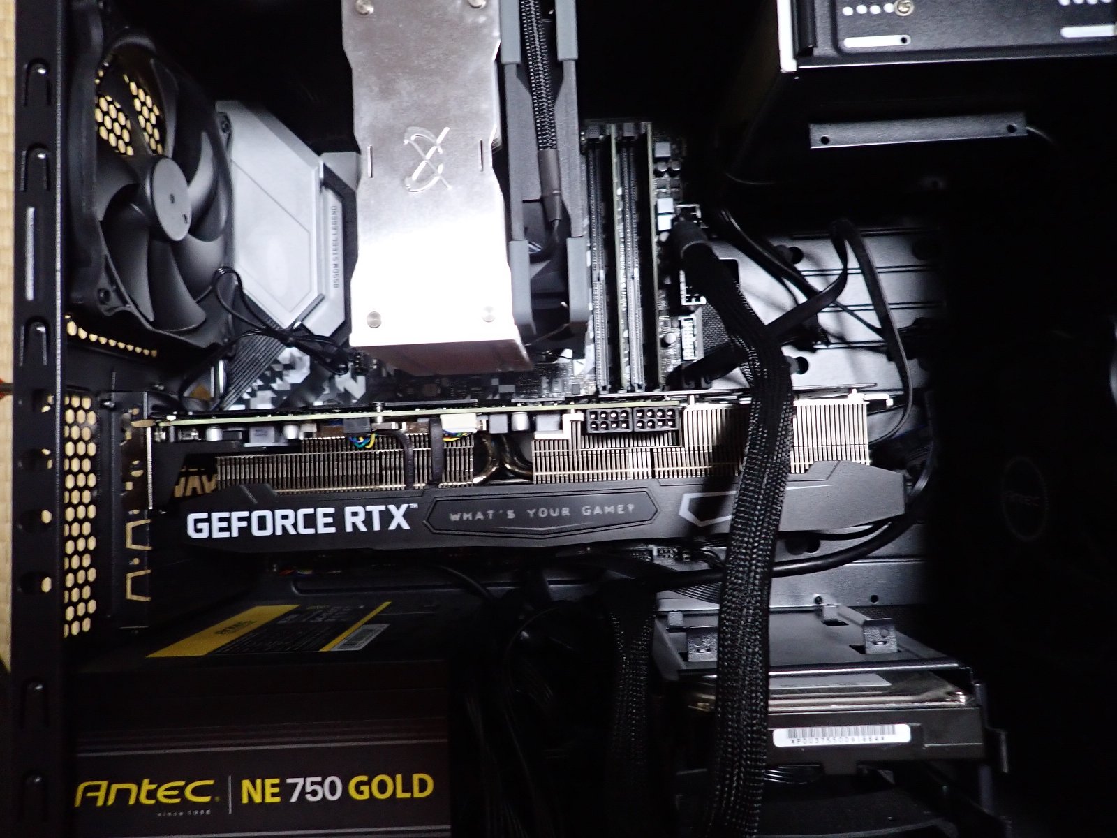 ただ、問題はカードの大きさです。うちのMATX基板ベースのケースではギリギリですし、付属の追加ファンやVGAステーなどは利用できませんでした(ファンはメモリに干渉するし、ステーはスペース的に入らない)。 なので、全部つけたい場合はフルタワー的なスペースが必要となります。 とにかく大きいのでケースなどによっては使えない場合がありますので注意が必要です(装着できてよかった)。