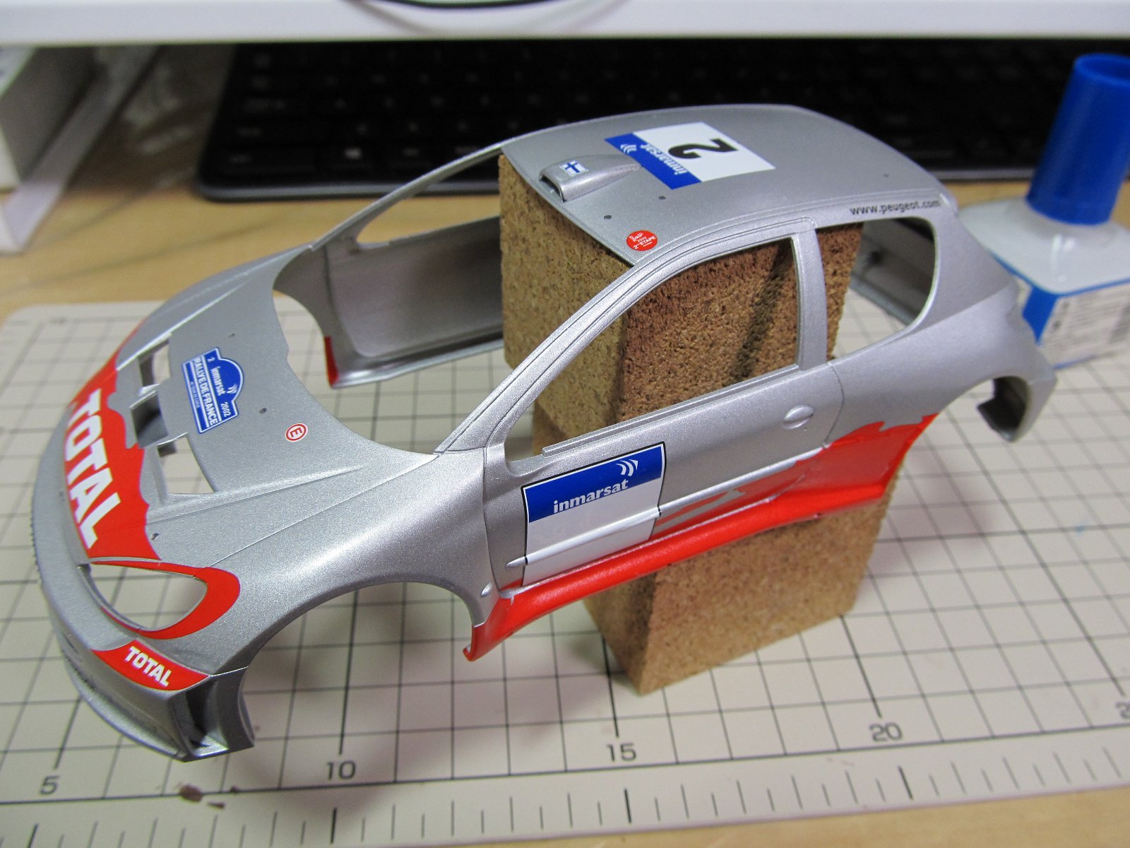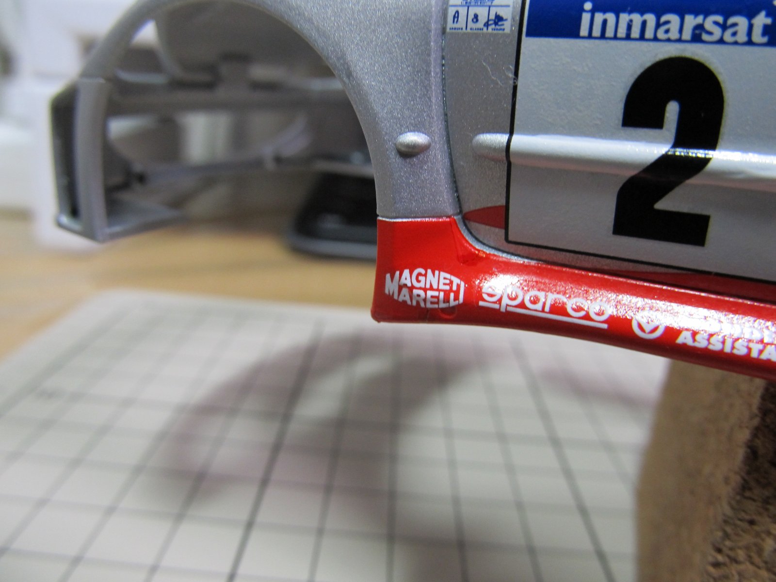 大まかなデカールは貼り終えました。ラリーカーは特にデカールの上にデカールというのが多いので一晩乾かします。それにしても赤いサイドの部分は塗装のほうが楽かもしれません。今回はデカールを利用しましたが、デカールと同じ赤が出せるのならば断然塗ったほうが楽できれいに仕上がります。