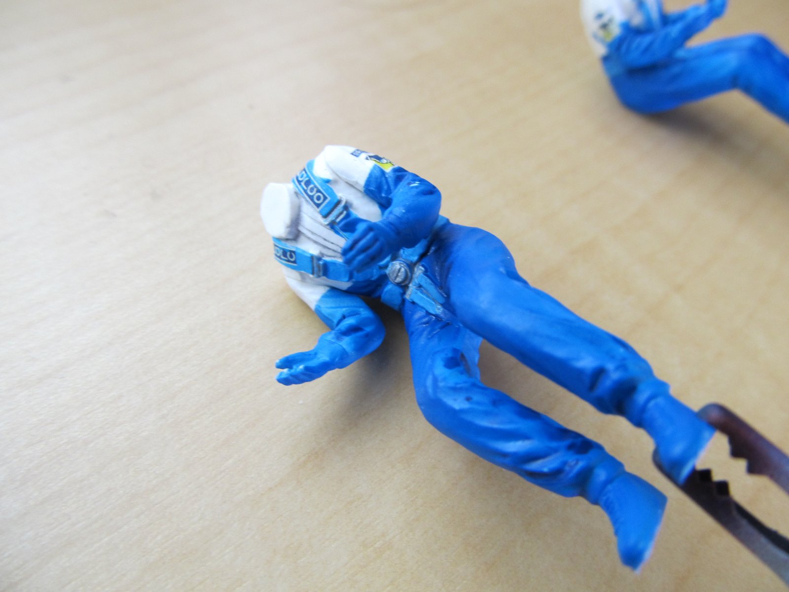 胴体もフラットホワイトとフタロシアニンブルーで適当に塗り分けます。その後、シートベルト用に水色を作りデカールを貼りました。デカールが古いため、どんどん分離していくので苦労しました。