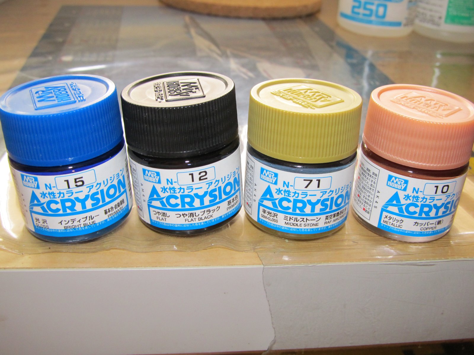 筆塗り用にクレオスのアクリジョンを購入してきました。ちょっとした塗装は筆塗りで行うことが多いのですが、冬の夜に窓を盛大に開けるのはつらいのでにおいの少ないコレを試します。