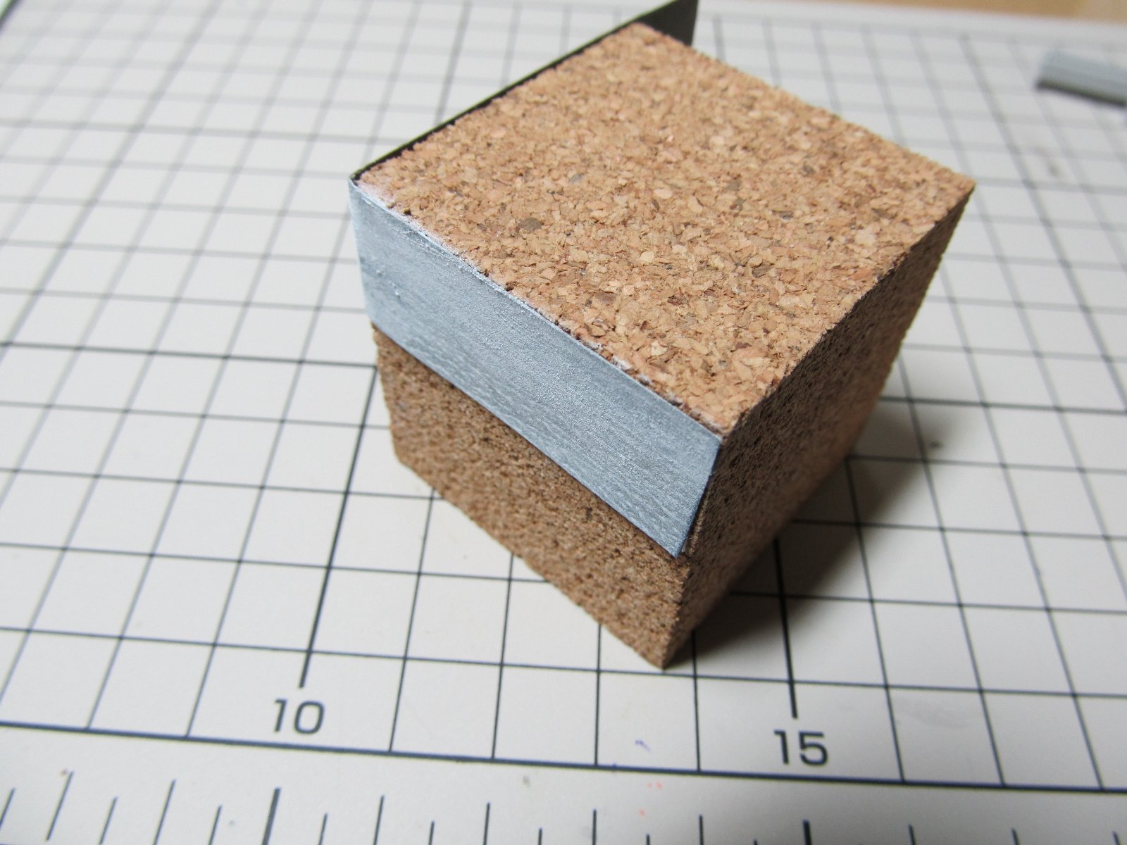 | 面を処理するときは、このようにコルクに両面テープで紙やすりを付けて作業しています。 |
