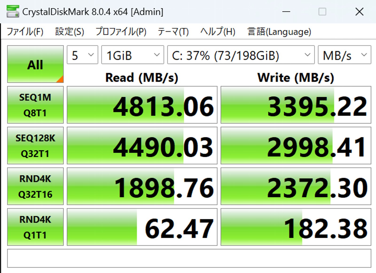 今回のSSDに載せ替えました。手順は前と一緒。速度は公称値くらい出てますね。