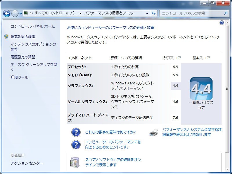 初期化後に取った性能です。Windowsは64bitです。5年前のPCの性能としては非常に高く実用充分だと思いますね。