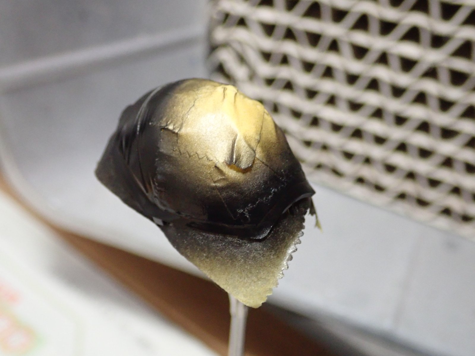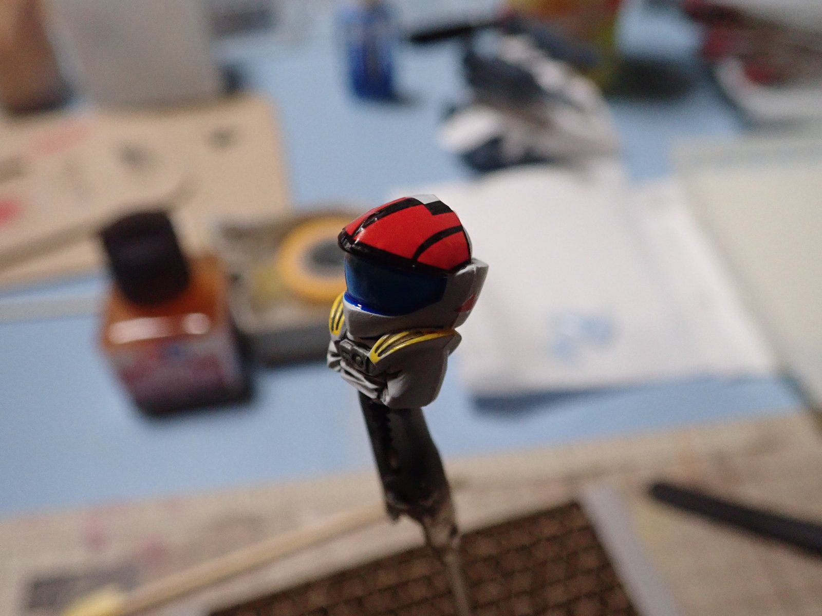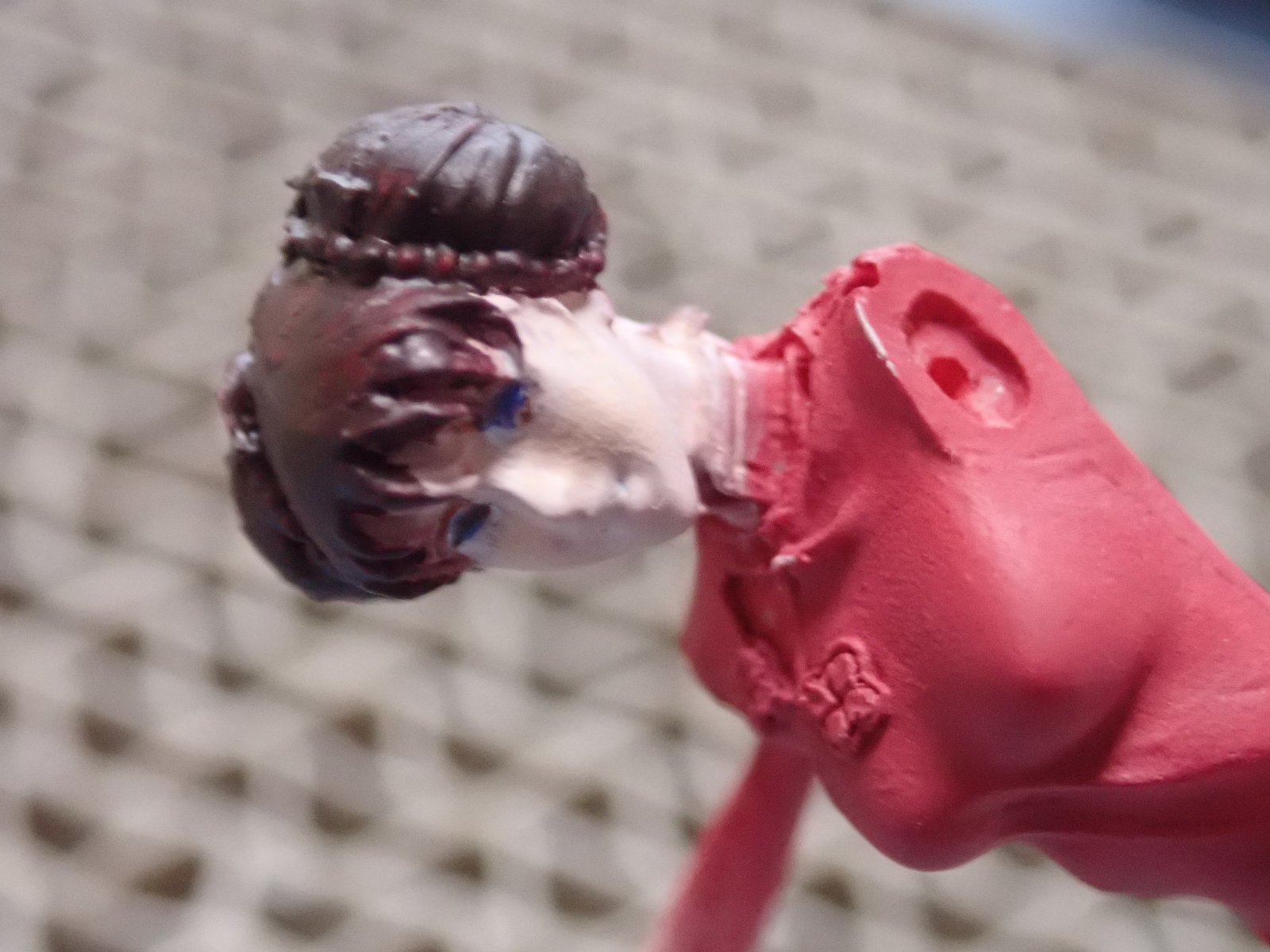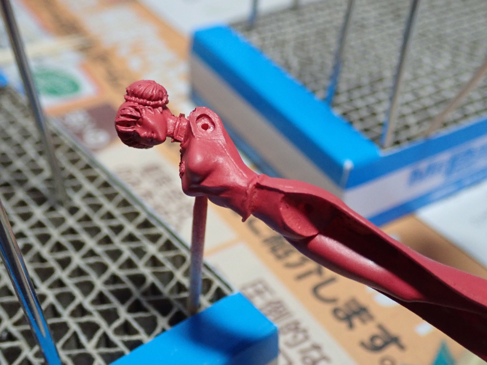 ピンぼけしてますが、顔を塗りました。髪はベースとしての茶色で、この後ブルーに塗っていきます。