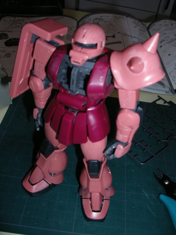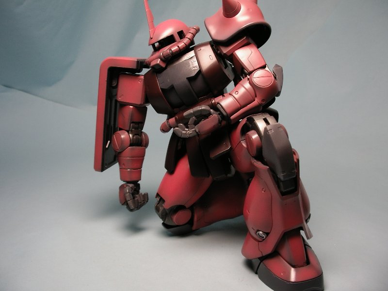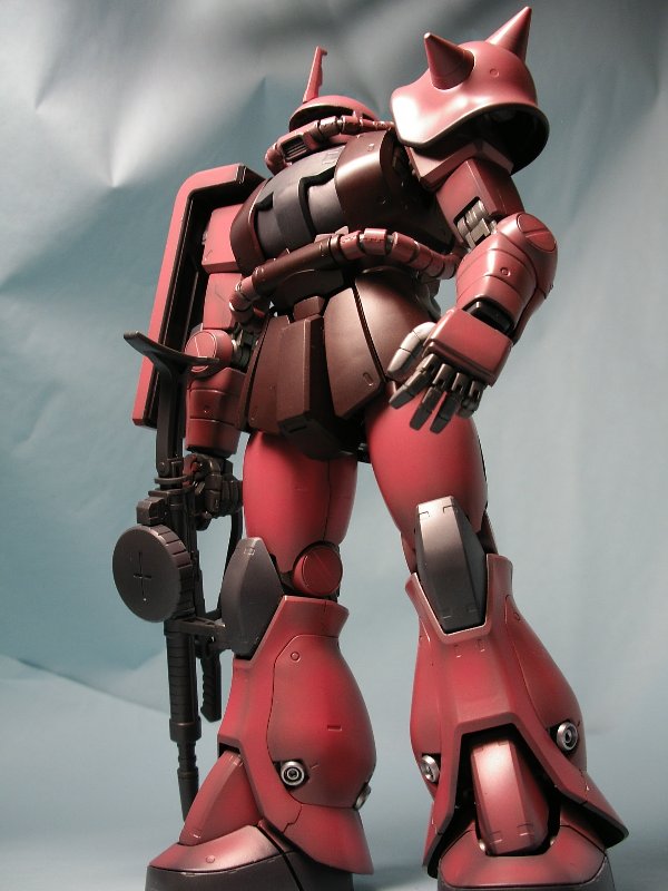 MGは本当に記述することがありません 基本的に組んでヤスリ掛け後に塗装しただけです。今回は下地にサフ代わりにミッドナイトブルーを塗ってその上に適当に作ったシャア専用色を塗りました。 | |
