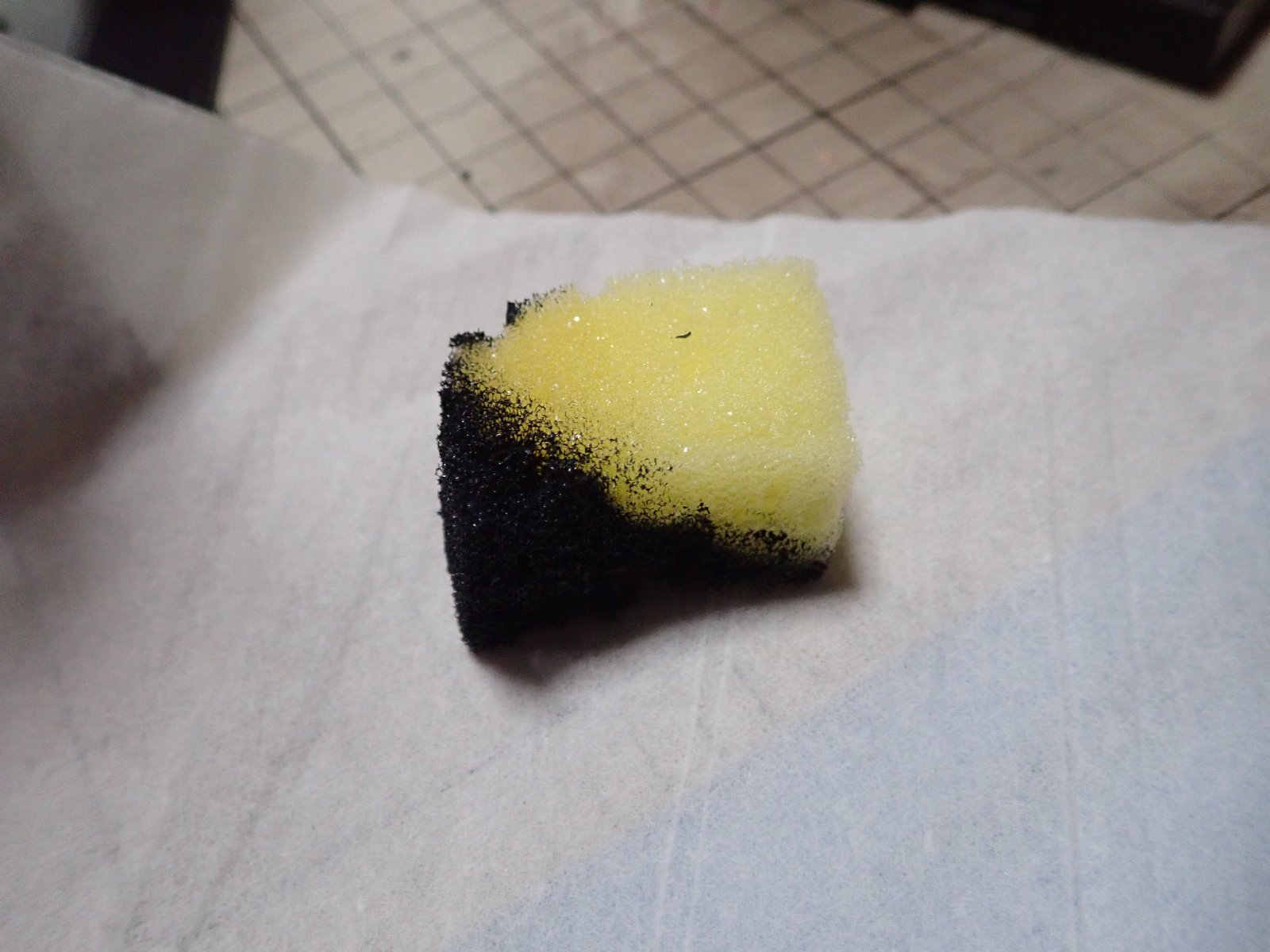 ディスプレイベース全体は水性ホビーカラーの513をベースで、スポンジでランダムに塗装します。その後、水性ホビーカラーの514でアクセントを入れ、Mrメタルカラーのダークアイアンでドライブラシ気味に仕上げます。あと、ライトもクリアーブルー、クリアーレッド、クリアーグリーンをエナメルで塗りました。