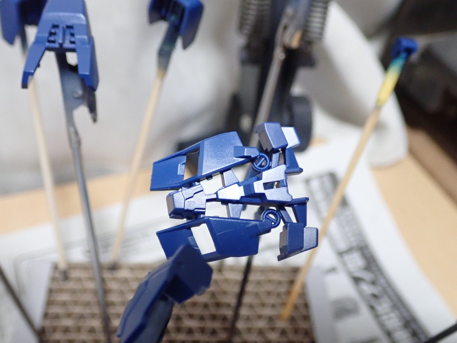 塗装開始です。今回は仮組みしないで塗装をしています。関節部はダークアイアン、腹部などのグレーはジャーマングレー、バーニアなどはチタンシルバーや焼鉄色を使っています。本体はGXメタルカラーのレッドゴールドで塗装してみました。ブルーはブルーFS15050(328)です。