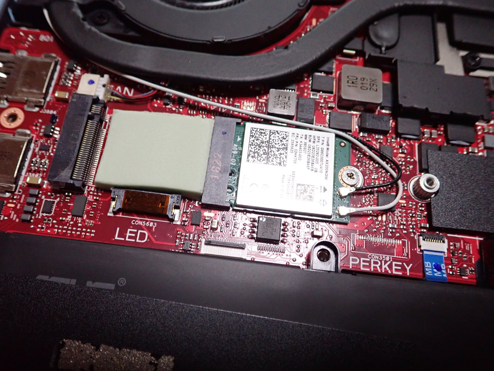 SSDを外すと下にWifiモジュールが設置されています。このレイアウトのせいでSSDは片面のみの製品しか入りません。事前にわかっていたので片面のSSDを購入しました。