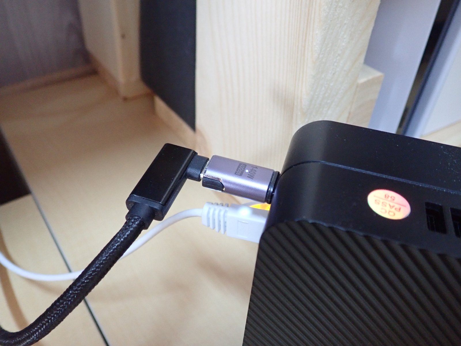 試しているとPDのケーブル(USB-C)を外して付け直すと起動するという謎現象が発生しています。根本の原因究明はおいておいて、この運用をしていたのですが、抜き差しを毎回すると面倒だしコネクタに負荷もかかりそうなのでこのアダプタを挟んで利用してみることに。