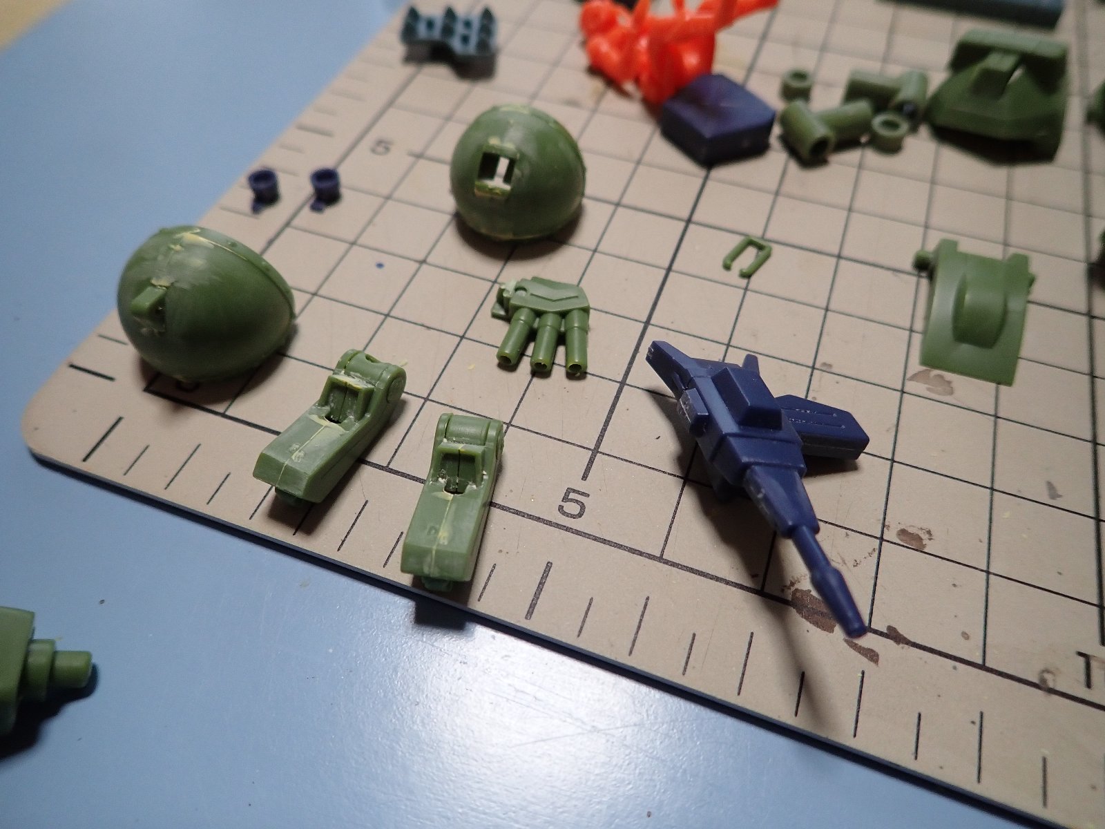 制作を始めました。まずは後ハメ用に加工します。ターボカスタムはほとんど後ハメ加工が不要なのですが、肩アーマーと脚部のローラーダッシュ&ブースター、武装くらいでしょうか。